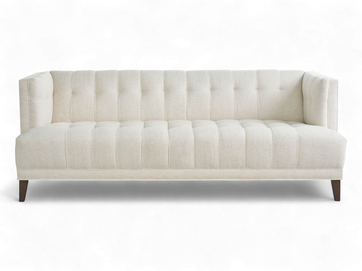 The Paxton sofa features a clean, tailored silhouette with deep button-tufted detailing across the backrest, seat, and inner arms, adding texture and visual interest. Upholstered in a soft, neutral cream fabric, it brings a bright and airy feel to any living space while maintaining a sophisticated look. The high shelter arms and plush cushioning offer both comfort and support, making it ideal for lounging or entertaining.