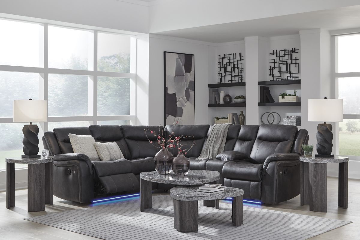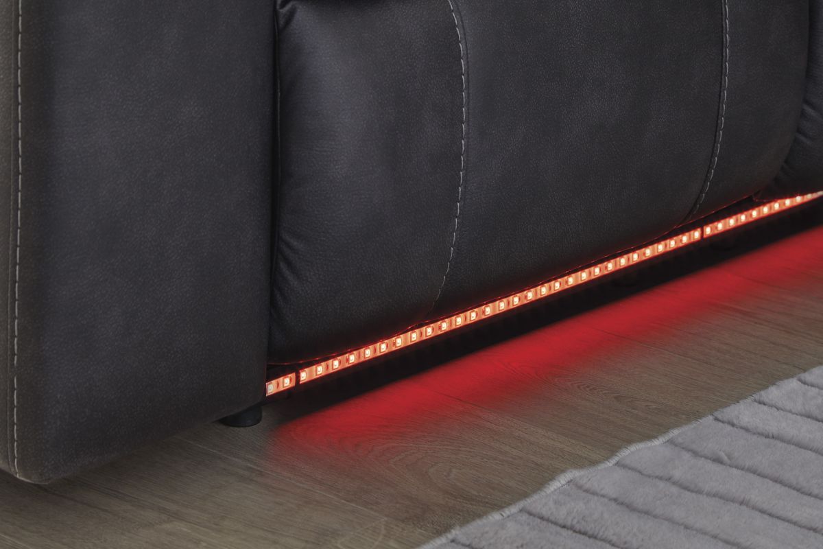This reclining sectional pairs the luxe look of faux leather with must-have functional features. LED lights on the underside put a modern twist on the simply chic design—choose from three colors to add ambiance to movie night or gaming with friends. And you can keep remotes, drinks and other entertainment essentials close with the handy console. Ready to relax? Easy pull tab reclining has you stretched out in no time.