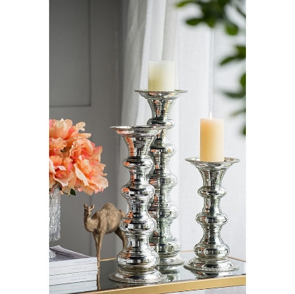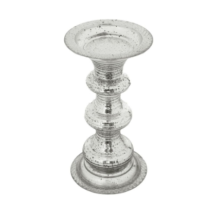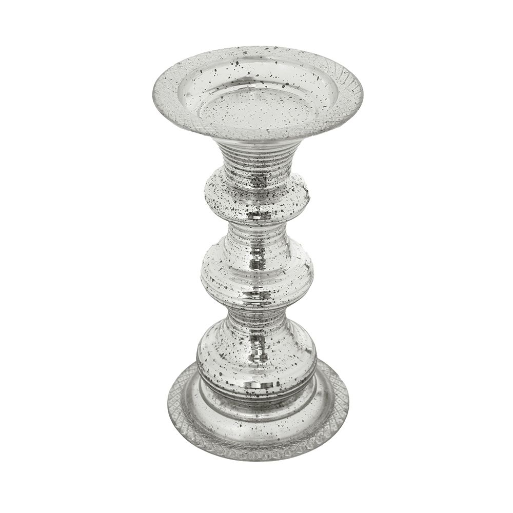 Crafted of antiqued silver glass, this pillar candle holder has a traditional look. The decorative holder has ribbed glass detail that enhances the round base. The shiny, metallic holder will add visual appeal along with functionality to your home.