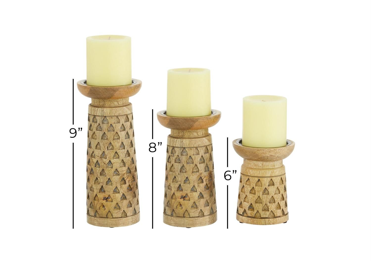Inspired by blissful serenity and the allure of the sea, where soothing hues and natural textures bring effortless charm to the home. Brown decorative candle holder set is crafted from mango wood, ensuring both durability and elegance. A matte natural brown wood finish highlights this round candle stand holder set, showcasing its earthy elegance. Hand-carved details on this wood set of 3 candle holders feature metal plates to secure each tapered candle in place and protective cushions to prevent base wear.