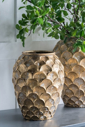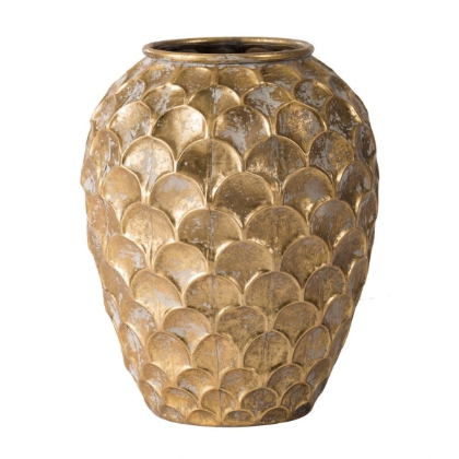 A weathered gold finish adds an eye-catching look to this traditional planter. Featuring a scalloped design that will be sure to add visual interest to any room in your home, this planter can fit floral arrangements, different types of plants, or it can just be a decorative piece that becomes the finishing touch to your interior style.
