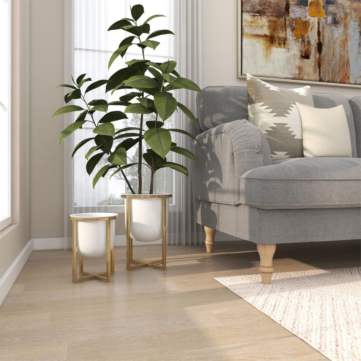 Embrace artistic expression with a style that highlights bold designs with sleek lines, neutral elements, and a minimalist aesthetic. Crafted from high-quality metal, these white indoor outdoor planter set are durable and designed to withstand the test of time. Round plant pot set possess a sleek, contemporary design with a polished white finish and gold stand that adds a refreshing aesthetic to any space. A standout feature of this metal set of 2 planters is the removable stand, which allows for versatility in display options.