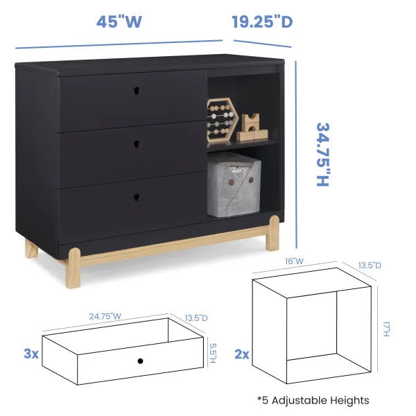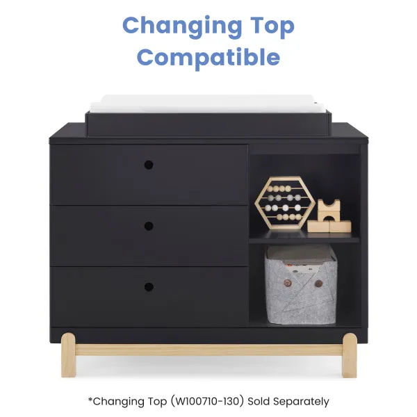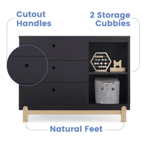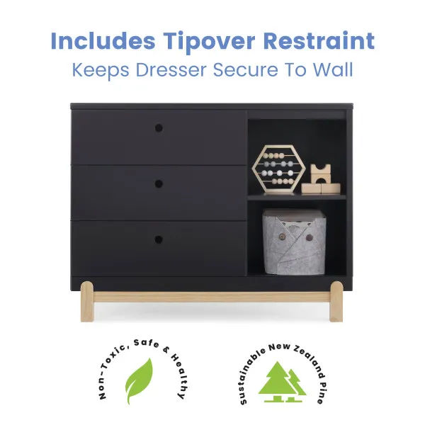 Bring style and convenient storage to your little one's bedroom with the Poppy 3 Drawer Dresser with Cubbies and Interlocking Drawers by Delta Children. This wood dresser features three drawers to keep shirts, pants and socks, while the other side features two open cubbies to house books, bins or toys. Modern and playful, this versatile dresser features a natural wood base and feet paired with a contrasting finish on top for a look that works from baby to big-kid. For your child’s safety, this dresser is outfitted with an interlocking drawer system that limits the number of drawers that can be opened at one time. Plus, it’s GREENGUARD Gold Certified, which means it’s built to contribute to cleaner air for a healthy home. To complete your child’s bedroom, pair the Poppy 3 Drawer Dresser with Cubbies with the Poppy 4-in-1 Convertible Crib by Delta Children. This Delta Children dresser is tested to meet the current requirements of ASTM F2057, the mandatory CPSC safety standard that protects young children from furniture tip-over incidents. For your children’s safety, only purchase dressers that comply with this standard. For additional security, Delta Children strongly recommends that all dressers in your home be anchored; all Delta dressers include a wall anchor. To learn how to properly secure your dresser, please see the product assembly instructions or visit our website.