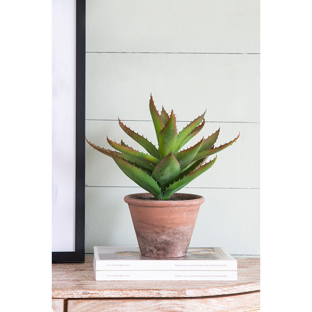 With its weathered pot, vibrant green leaves, and delicate spikes, this faux Black Prince succulent offers the timeless beauty of a real plant without the usual maintenance or hassle. Measuring 13H x 5.5D, it is a versatile accent piece that will draw attention from any desk, mantel, or countertop. The textured leaves and deep, organic colors allow this plant to complement bohemian, rustic, farmhouse, and modern themes, ensuring it can slot into any setting seamlessly.