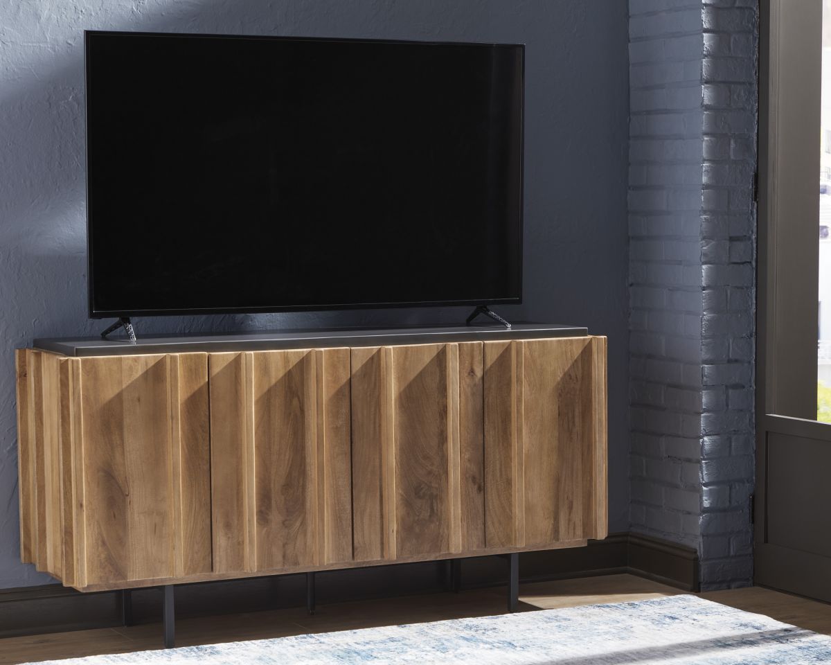 This striking accent cabinet offers a magnificently modern vibe with its high-low design and sleek metal legs. Bathed in an inviting light brown finish, it features a contrasting charcoal gray top for a touch of industrial chic. Four doors conceal fixed shelves, providing ample storage space. Convenient openings in the back allow for easy cord management.