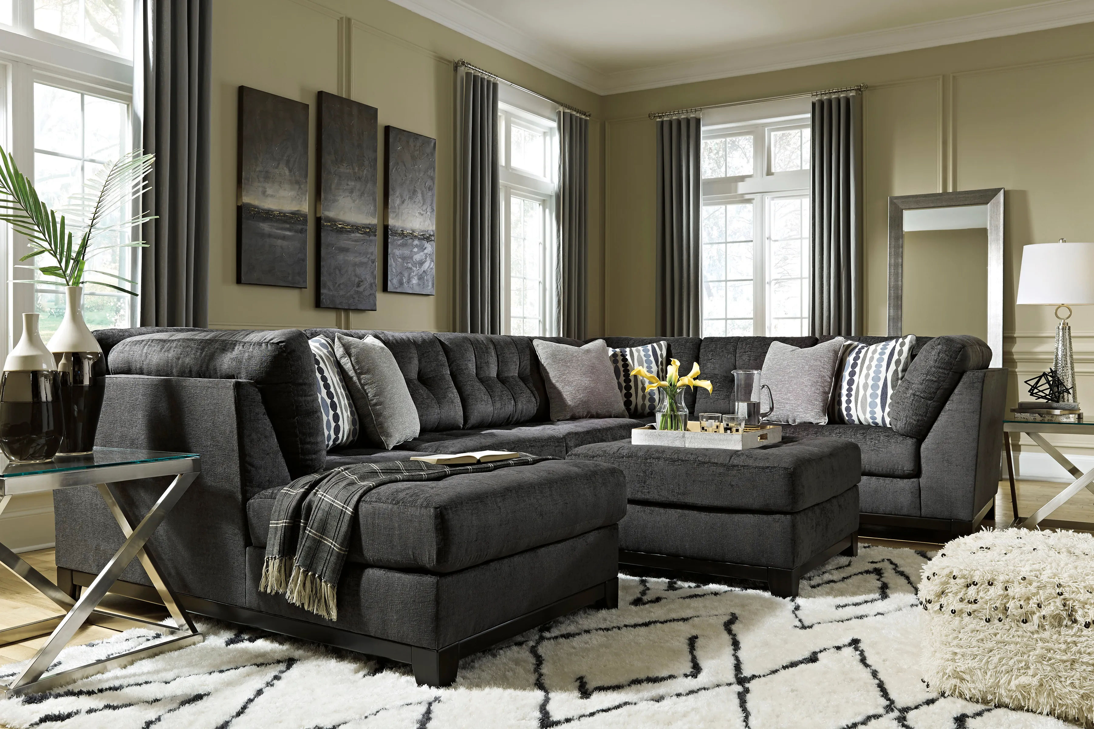 Stealing the show in a steel gray upholstery that's wonderfully plush and so on trend, the Reidshire sectional takes center stage when it comes to comfort and contemporary style. Details including subtle grid tufting and an exposed rail design give this richly tailored sectional standout character. Complementary toss pillows enhance the experience.