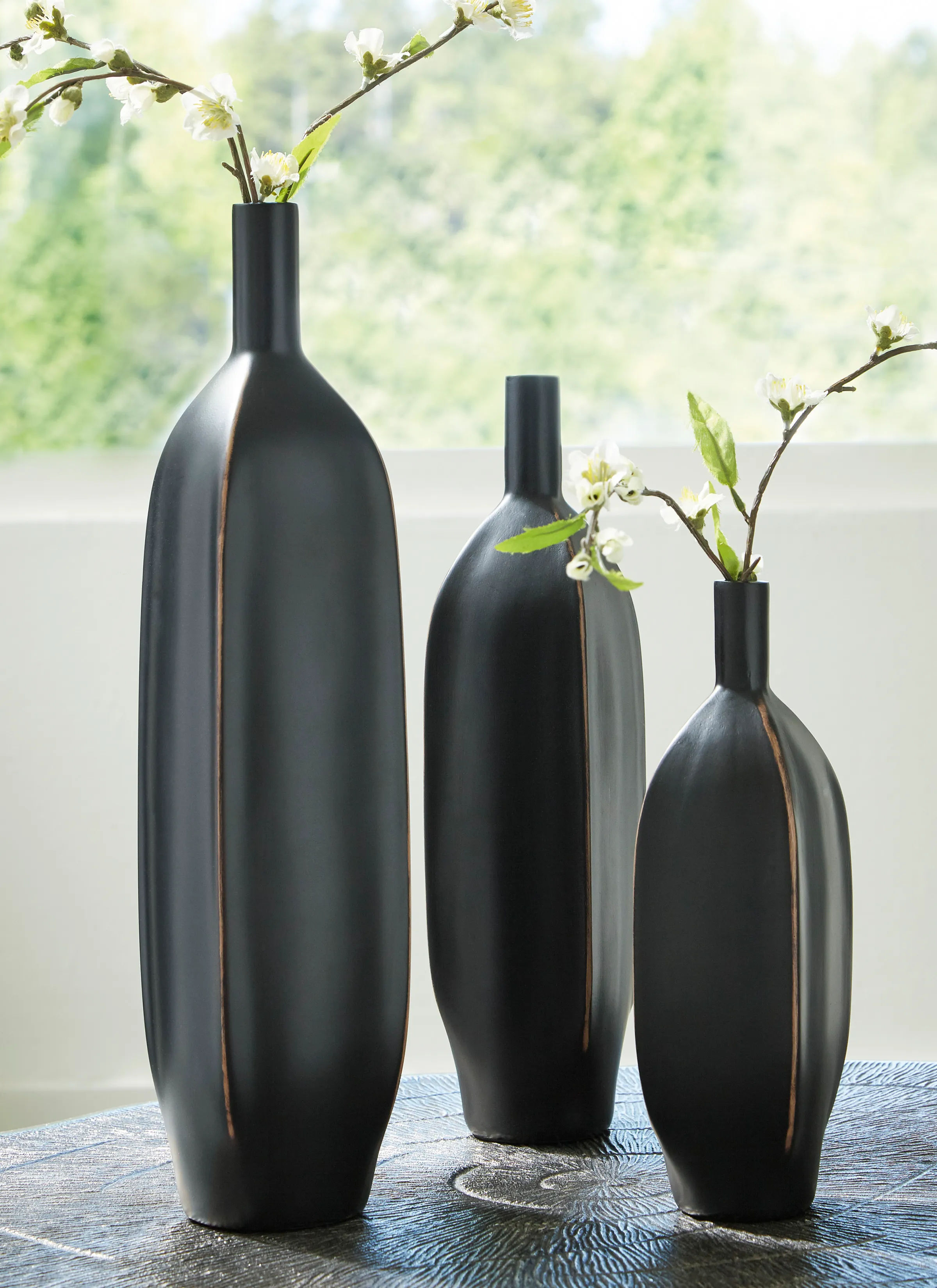 Impress with the simply sleek stylings of the Rhaveney vase. A black finish coats the piece, with a brown rub on the corners acting as a subtly eye-catching design element. What a chic addition to your bookcase, mantel or tabletop.