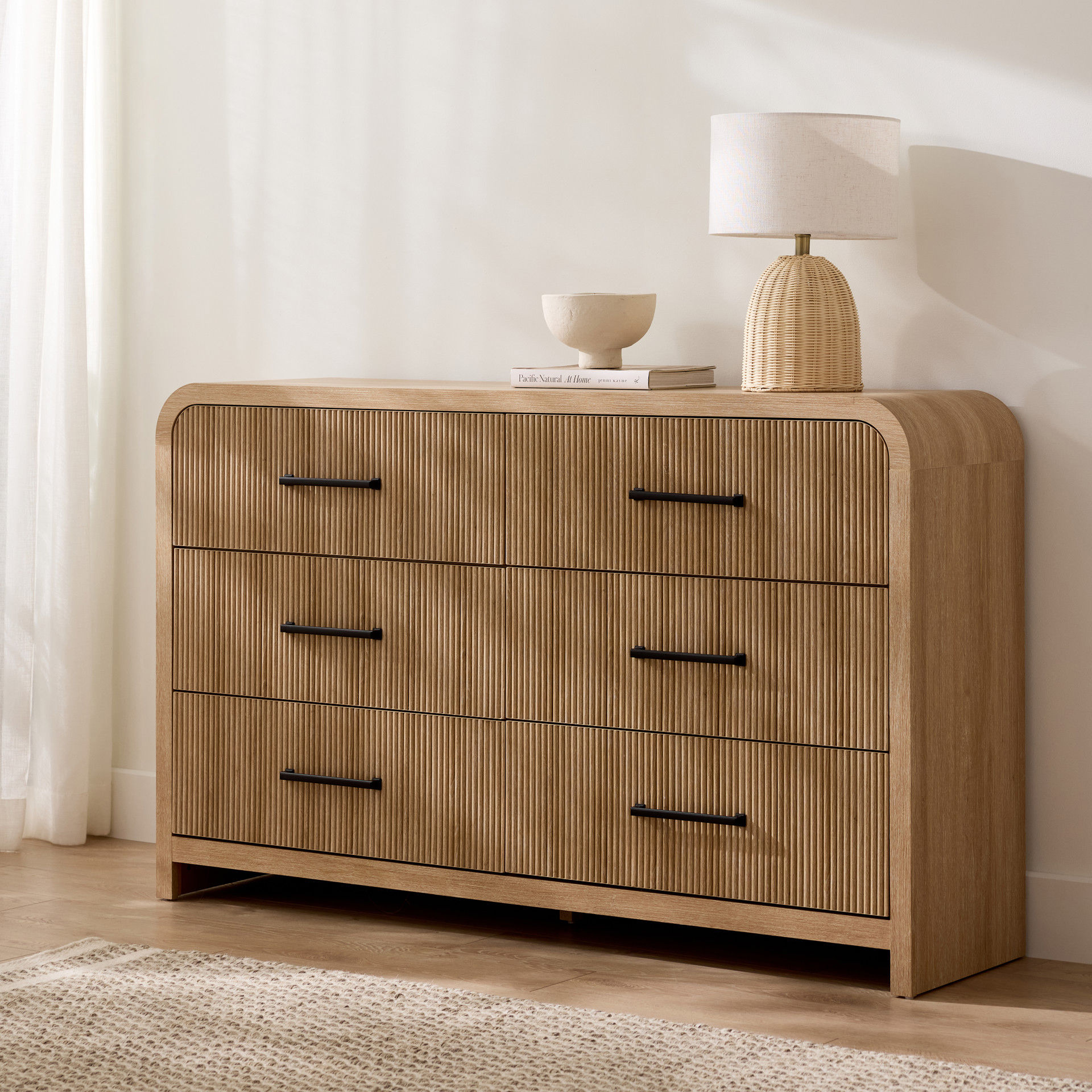 Transform your bedroom into a serene, modern retreat with the Ridgemont Dresser. Showcasing a light wood finish with natural grain detailing, this dresser radiates warmth and style. Vertical reeding throughout adds texture and sophistication, while sleek, rounded edges provide a soft, inviting touch. Spacious drawers, accented with bold black bar pulls, offer ample storage. Clean, minimalist lines make this dresser the perfect complement to any modern decor. Elevate your space with effortless elegance.