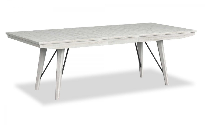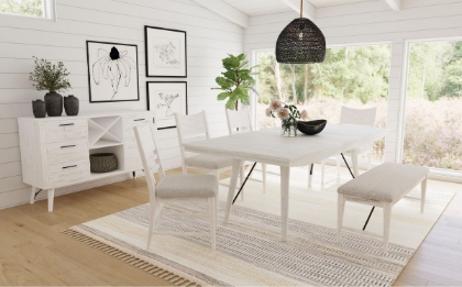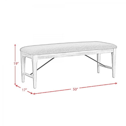 The distressed white finish on the Rogen Dining Bench will add a modern farmhouse style to your dining area. The contrasting black metal hardware creates more visual interest and the gray fabric upholstery on the seat will add more comfort while you dine.