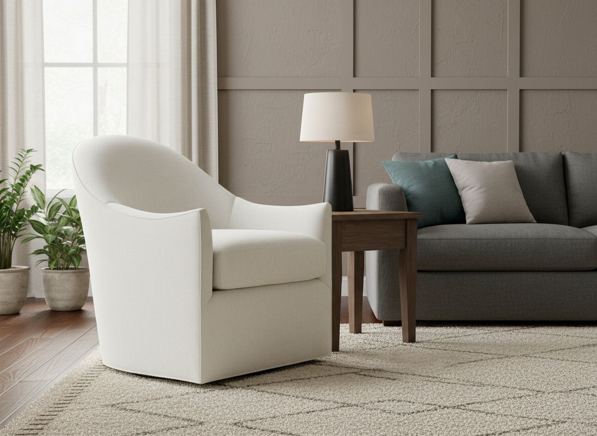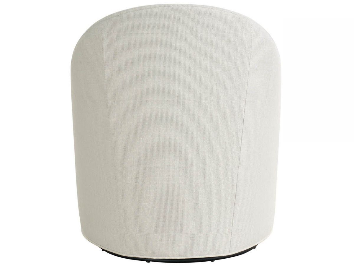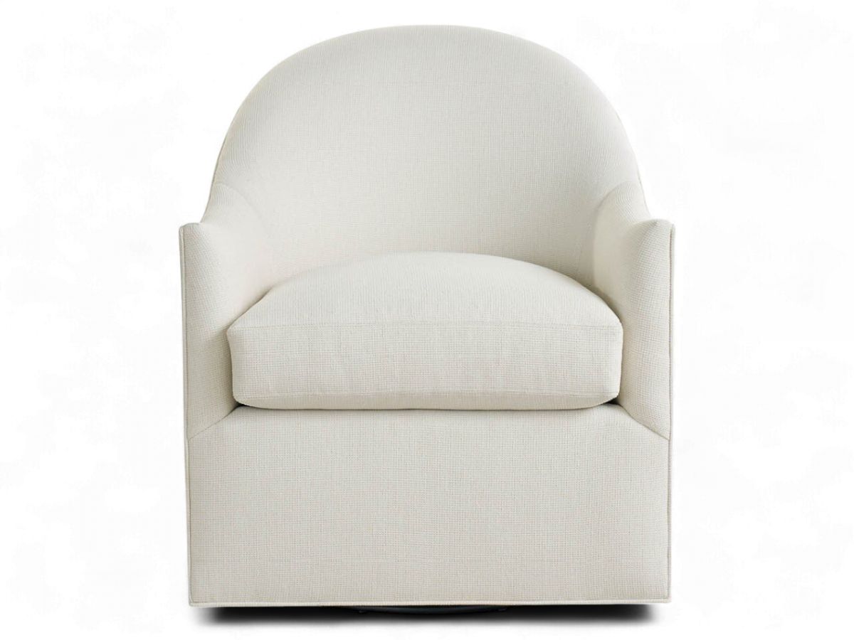 The Roscoe swivel chair showcases a modern, minimalist design with a soft, curved back and gently sloped arms that create a cozy, inviting silhouette. Upholstered in a textured ivory fabric, it exudes a clean, sophisticated aesthetic that complements a wide range of interior styles. The generously padded seat cushion ensures exceptional comfort, while the hidden swivel base adds functionality without compromising its sleek look.