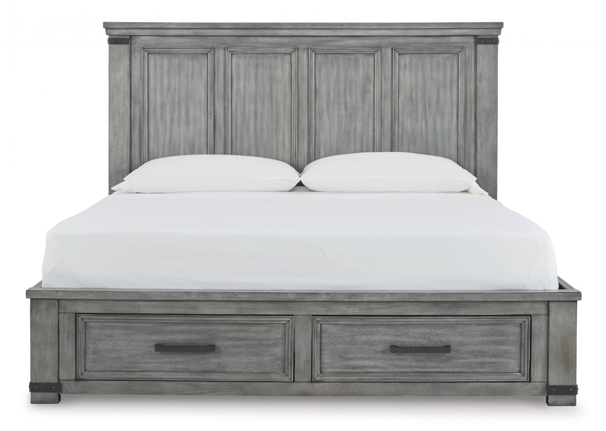 With its light weathered gray coloration, the Russelyn storage bed conveys trend-right urban farmhouse style. Thick-profiled top moulding on the tall, mansion-scale headboard lends a fresh take on a timeless design. The footboard features two storage drawers with profiled frames and dovetail construction. Bar pulls and metal straps in a dark aged bronze tone add to the rustic-yet-refined aesthetic.