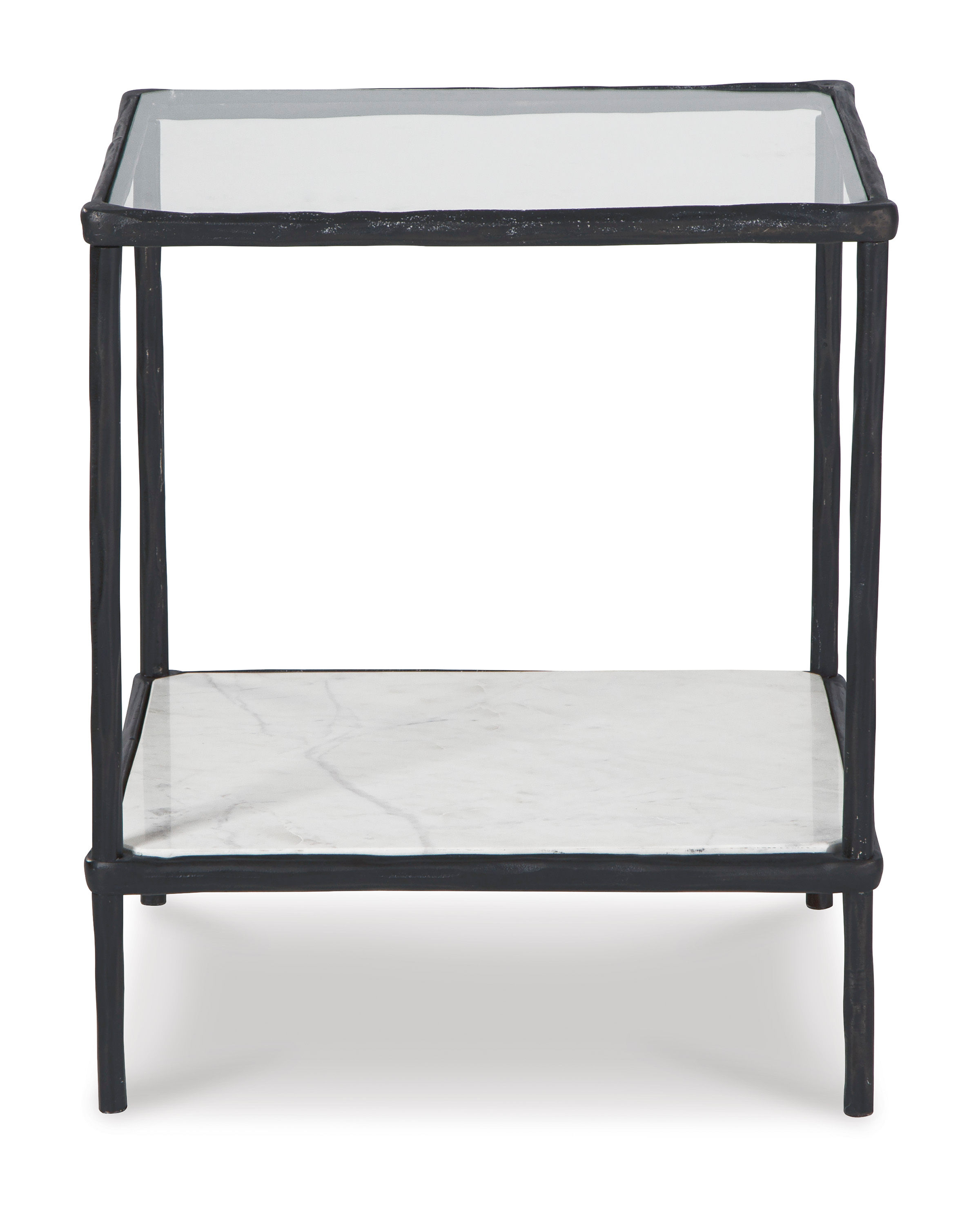 Classic in design with a dash of textural appeal, the Ryandale accent table provides both flair and function. The glass tabletop offers the perfect perch for a lamp, while the white marble lower shelf is ideal for resting trendy coffee table books and other decorative pieces. An antiqued black finish on the frame has an edgy look that remains versatile, suiting spaces from casual to contemporary.