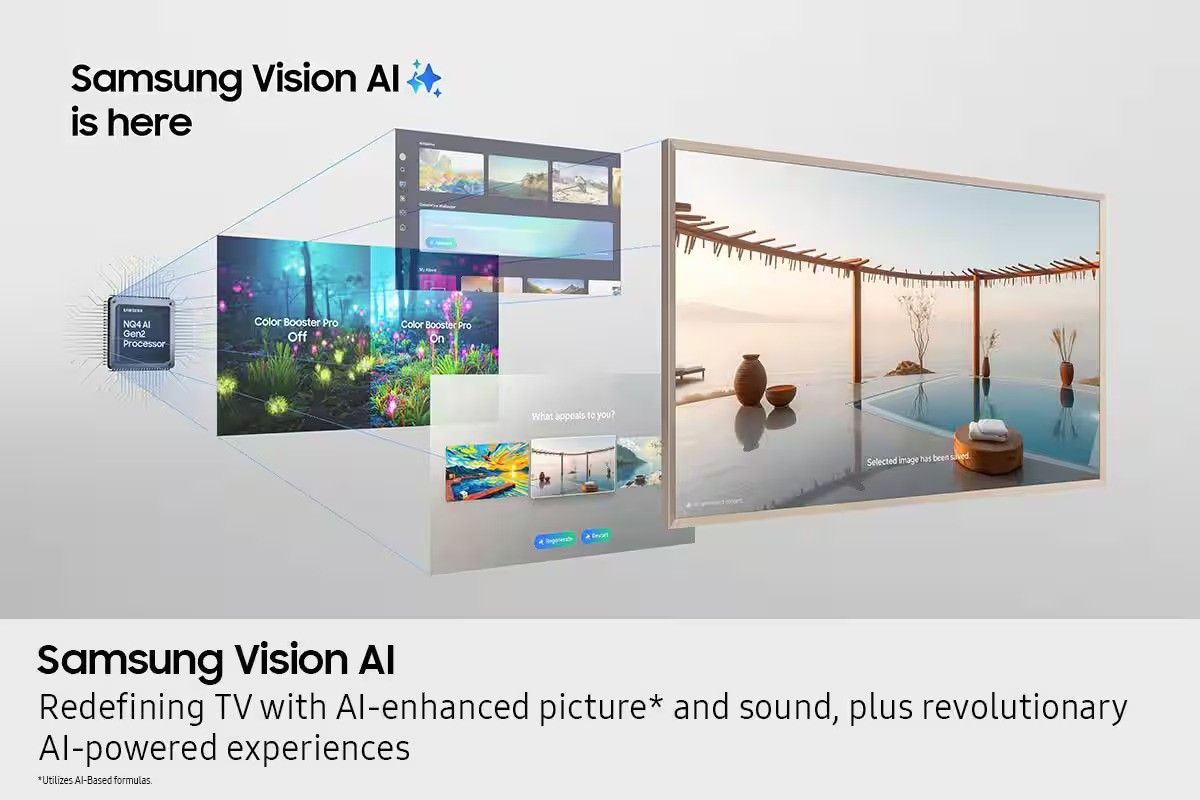 Our most advanced Art TV blurs the lines between showpiece and entertainment for art and movie lovers alike. The modern, slim bezel frame, matte screen and wireless connection allow you to create a clutter free gallery experience at home, featuring a selection of world renowned artwork. Whether you're beholding a masterpiece or curling up to watch your favorite movie, enjoy spectacular, 4K Neo QLED picture and sound quality, along with personalized TV experiences powered by Samsung Vision AI.