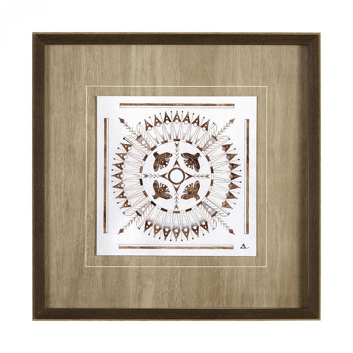 "Sandpainting-Watercolor I" by Mercana Studio is a captivating framed art print that elegantly combines geometric precision with nature-inspired motifs, showcasing intricate symmetrical patterns and stylized leaves in earthy, warm tones. Hand-embellished to add texture and depth, this piece's delicate design comes to life under glass, offering both sophistication and serenity. Perfect for elevating any space, this artwork invites contemplation and inspiration with its harmonious blend of natural and abstract elements.