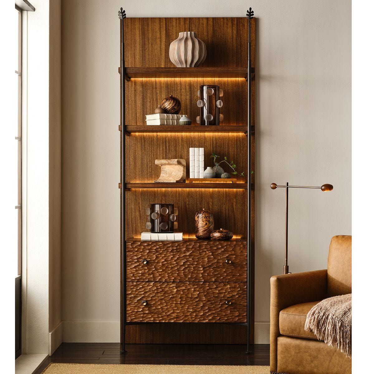 Drawers & shelves appear to float, enhanced by adjustable LED backlighting. Paldao veneer back and two-drawer base are supported by steel uprights, with a bronzed finish, topped with finials of stylized sapling leaves. Beautiful single or group in multiples to create stunning architectural paneling.