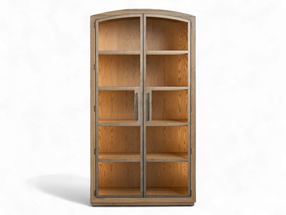 The Scribe Cabinet is a stunning piece of modern furniture. Its sleek, rounded top and minimalist silhouette create a refined aesthetic. The combination of metal doors and a wood case, illuminated by an LED light strip, adds a touch of industrial chic. The three adjustable shelves and one fixed wood shelf offer ample storage space for books, collectibles, or other cherished items.