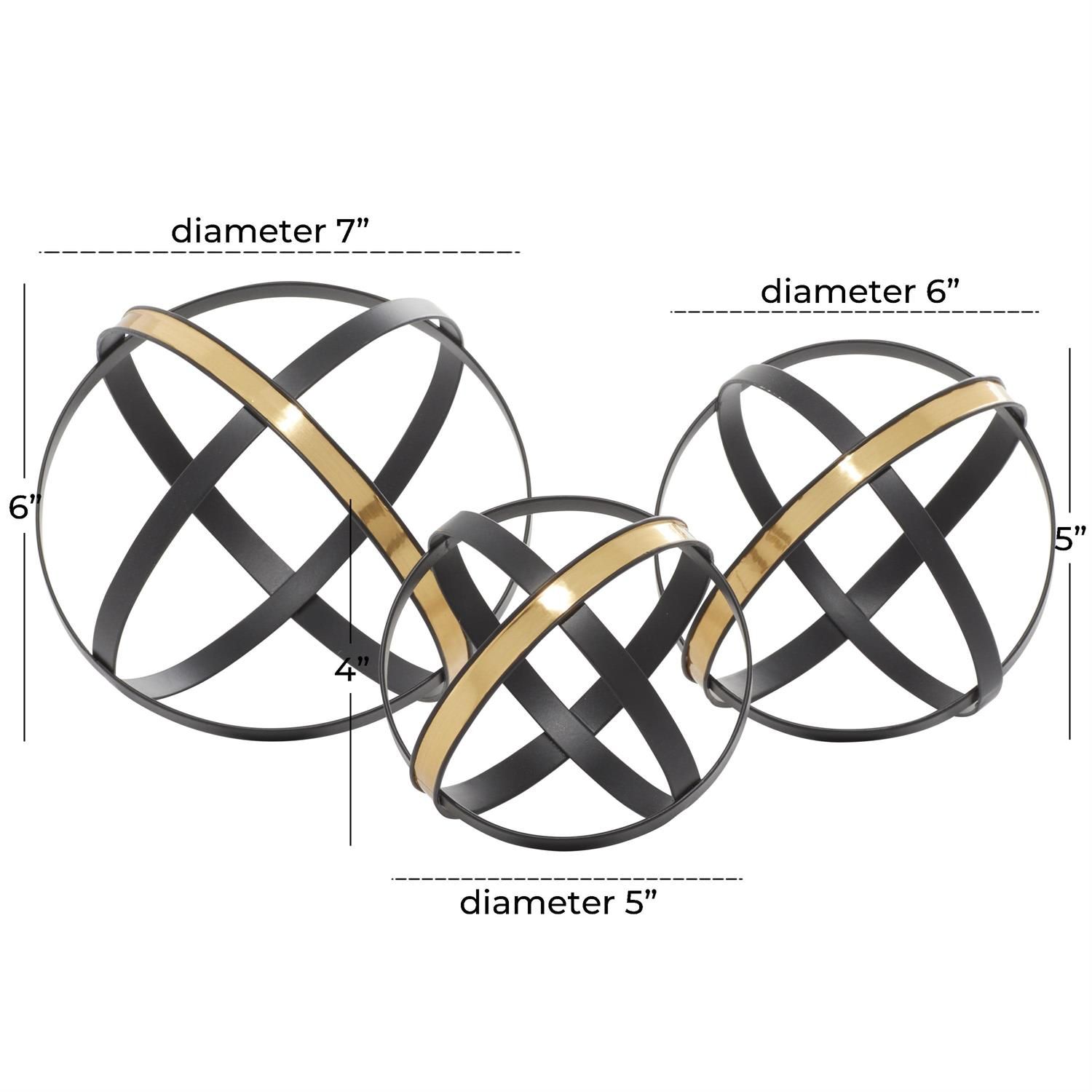 Embrace artistic expression with a style that highlights bold designs with sleek lines, neutral elements, and a minimalist aesthetic. Black decorative sculpture set is made of solid iron strips forming orb shapes. Round decorative statue set features a matte black finish accented with metallic gold strips, creating a striking visual contrast. The iron set of 3 sculptures boasts neutral tones and lightweight design, making it suitable for any room.