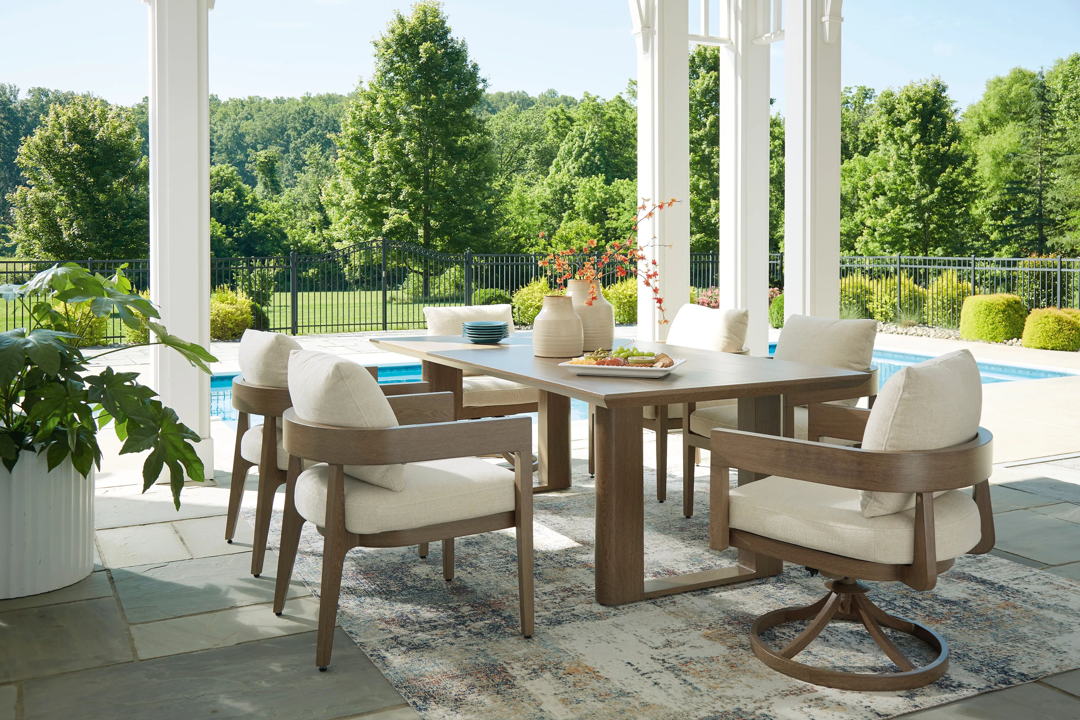 Elevate the appeal of easy-breezy living with the Serene Bay outdoor dining table. Made to look like wood yet durable enough to weather the elements, this rectangular table is sure to serve you and your besties well, year after year. Its cool character is made for warm memories; an umbrella hole offers the option of sweet shade.