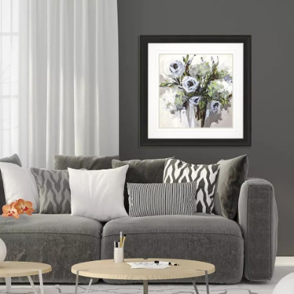 A charming floral bouquet is matted in white. Framed in an espresso finish moulding with antique silver accented edges.