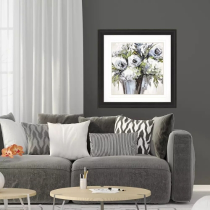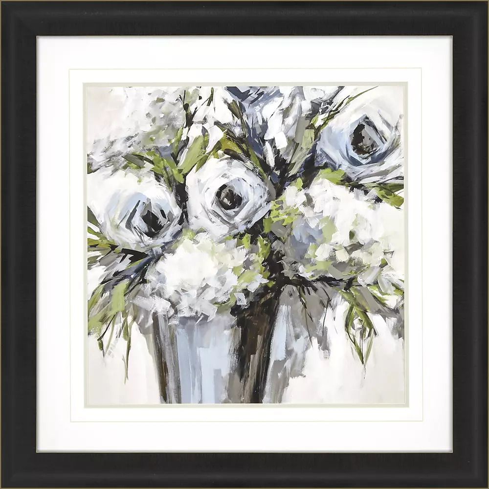 A charming floral bouquet is matted in white. Framed in an espresso finish moulding with antique silver accented edges.