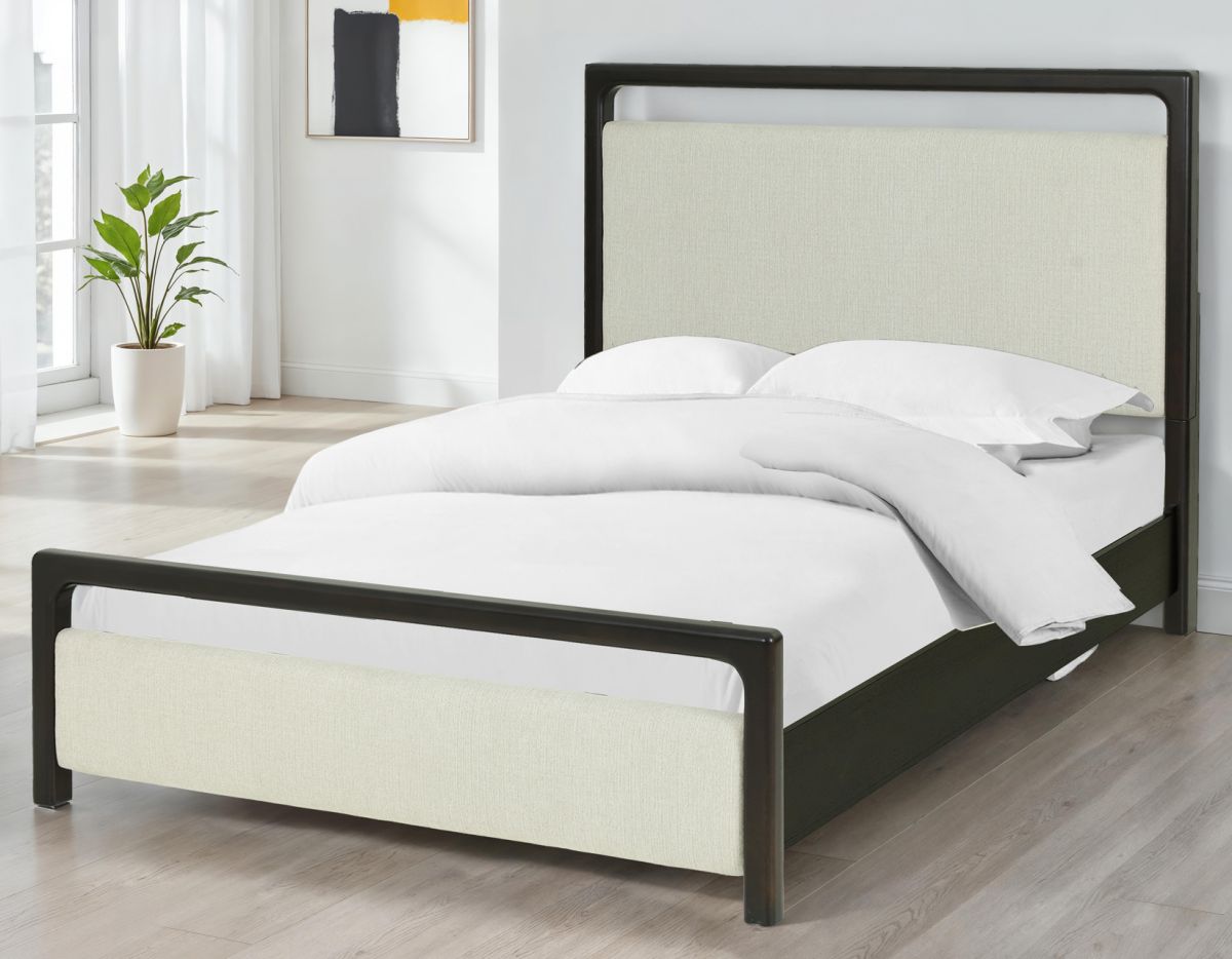 The Sigmund Queen Bed blends modern rustic styling with exceptional comfort. Crafted from solid Asian hardwoods, oak veneers, and engineered woods, it features a rich sable stain paired with a cream polyester-upholstered headboard insert—creating a cozy spot for reading or watching TV. Softly rounded corners, smooth edges, and the signature Sigmund open-space design complete the look, bringing warmth and contemporary character to any bedroom.