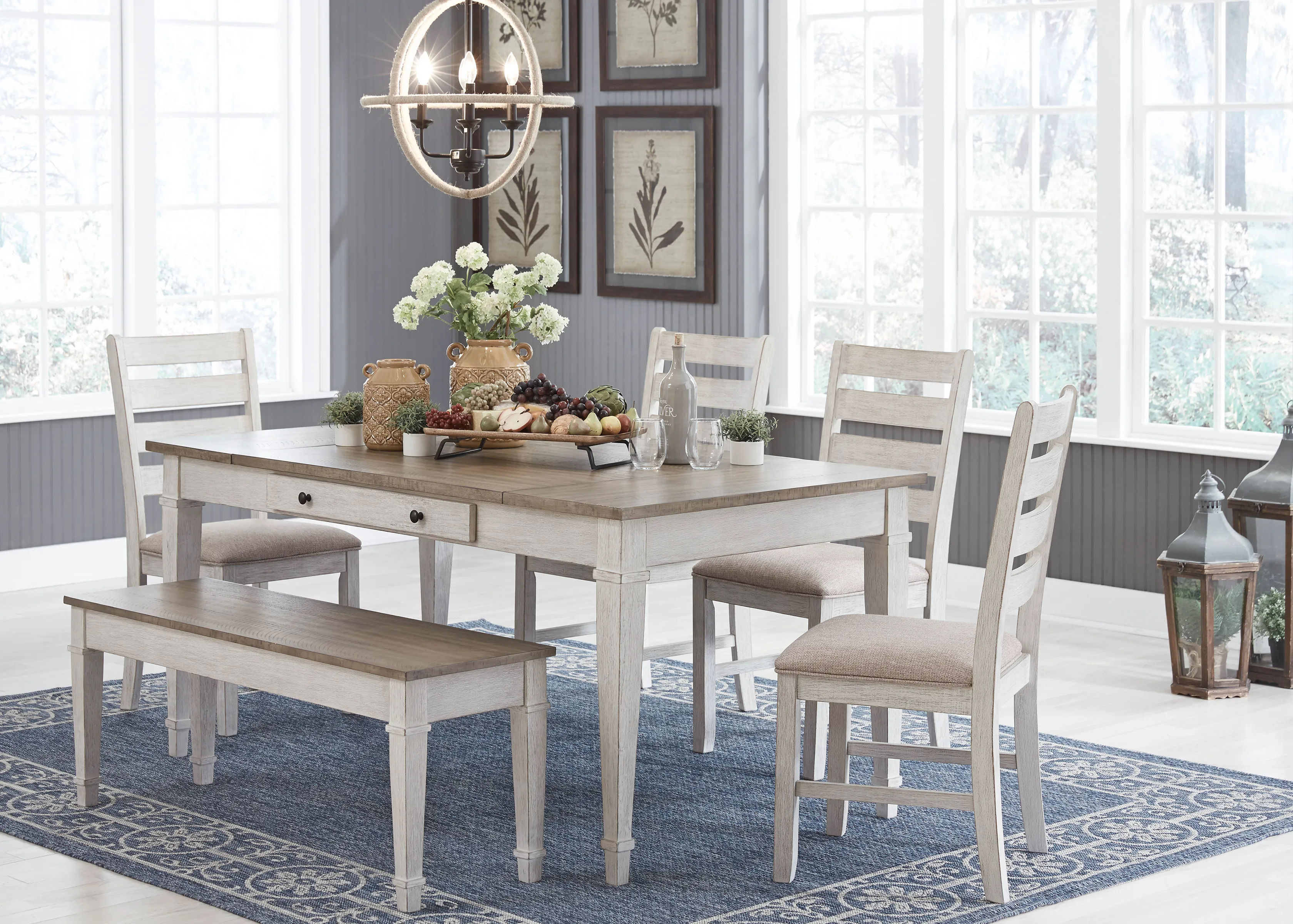 Set the scene for coastal chic or modern farmhouse living with the Skempton dining room table. Clean-lined, simply striking table doubles the charm with a brown tone top with plank effect, paired with a grayish white base with rub through effect for timeworn appeal. Multi-functional dining table features two convenient side drawers and a storage bin on each end for maximum use of space. Styled to comfortably seat six, this table makes room for one and all.