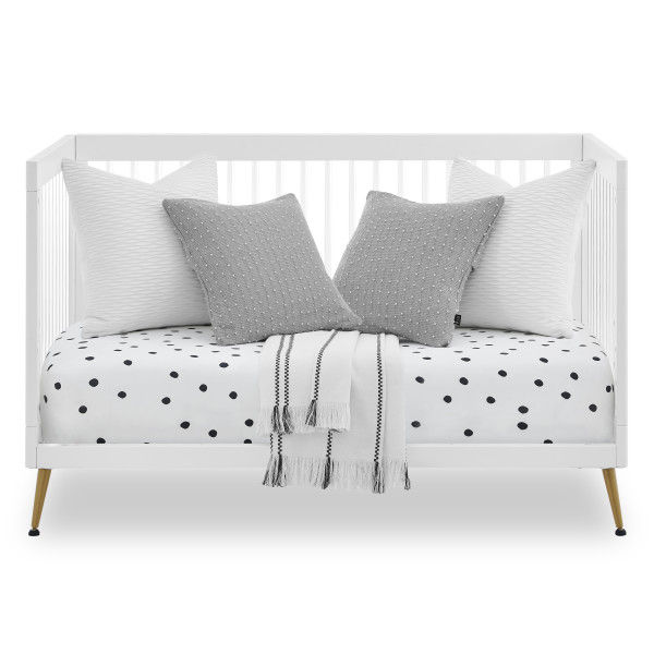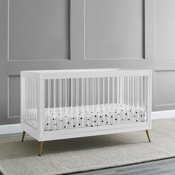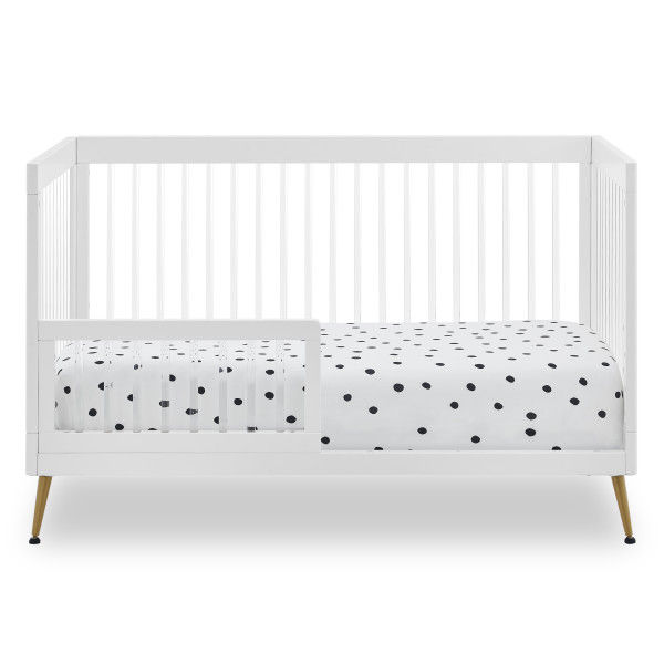 The Sloane 4-in-1 Acrylic Convertible Crib by Delta Children is the clear choice for your baby’s modern nursery! Its unique design features clear acrylic spindles that provide an open, airy feel while the splayed feet add some polish to the clean lines. And if that's not enough, it even converts from crib to a toddler bed, sofa and daybed, making this a versatile bed that grows with your child (conversion rail included). To complete your nursery, pair with the coordinating Sloane 4 Drawer Dresser. This crib is available in Bianca White, Black and Acorn, The Acorn finish is crafted with a special hand-applied glaze for added depth and dimension.
