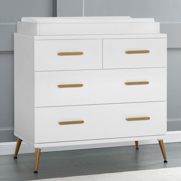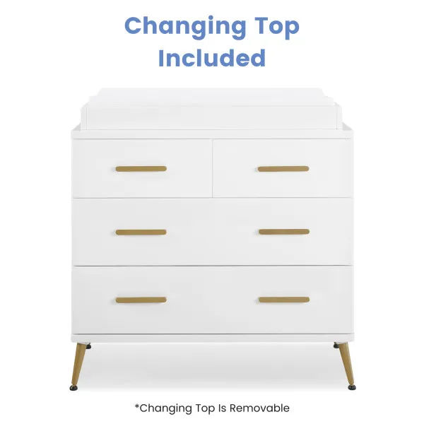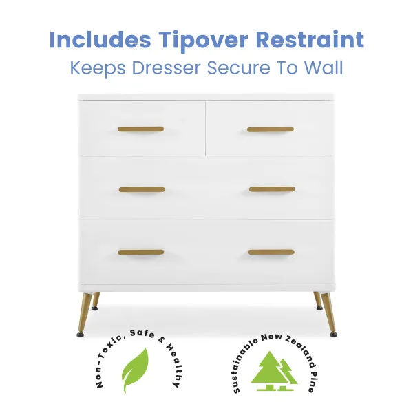 The Sloane 4 Drawer Dresser with Changing Top and Interlocking Drawers by Delta Children is the ultimate piece of kids’ furniture. Sleek and modern, it boasts a mixed material design with bronze splayed feet and drawer handles that make it elevated enough for your master bedroom. But this dresser is more than just fashionable—it's super functional, too. It features four spacious drawers for ample clothing storage and includes a removable changing top that creates the perfect space for diaper changing. Remove the changing top to create a more grown-up space later on. For your child’s safety, this dresser is outfitted with an interlocking drawer system that limits the number of drawers that can be opened at one time. This Delta Children dresser is tested to meet the current requirements of ASTM F2057, the mandatory CPSC safety standard that protects young children from furniture tip-over incidents. For your children’s safety, only purchase dressers that comply with this standard. For additional security, Delta Children strongly recommends that all dressers in your home be anchored; all Delta dressers include a wall anchor. To learn how to properly secure your dresser, please see the product assembly instructions or visit our website.