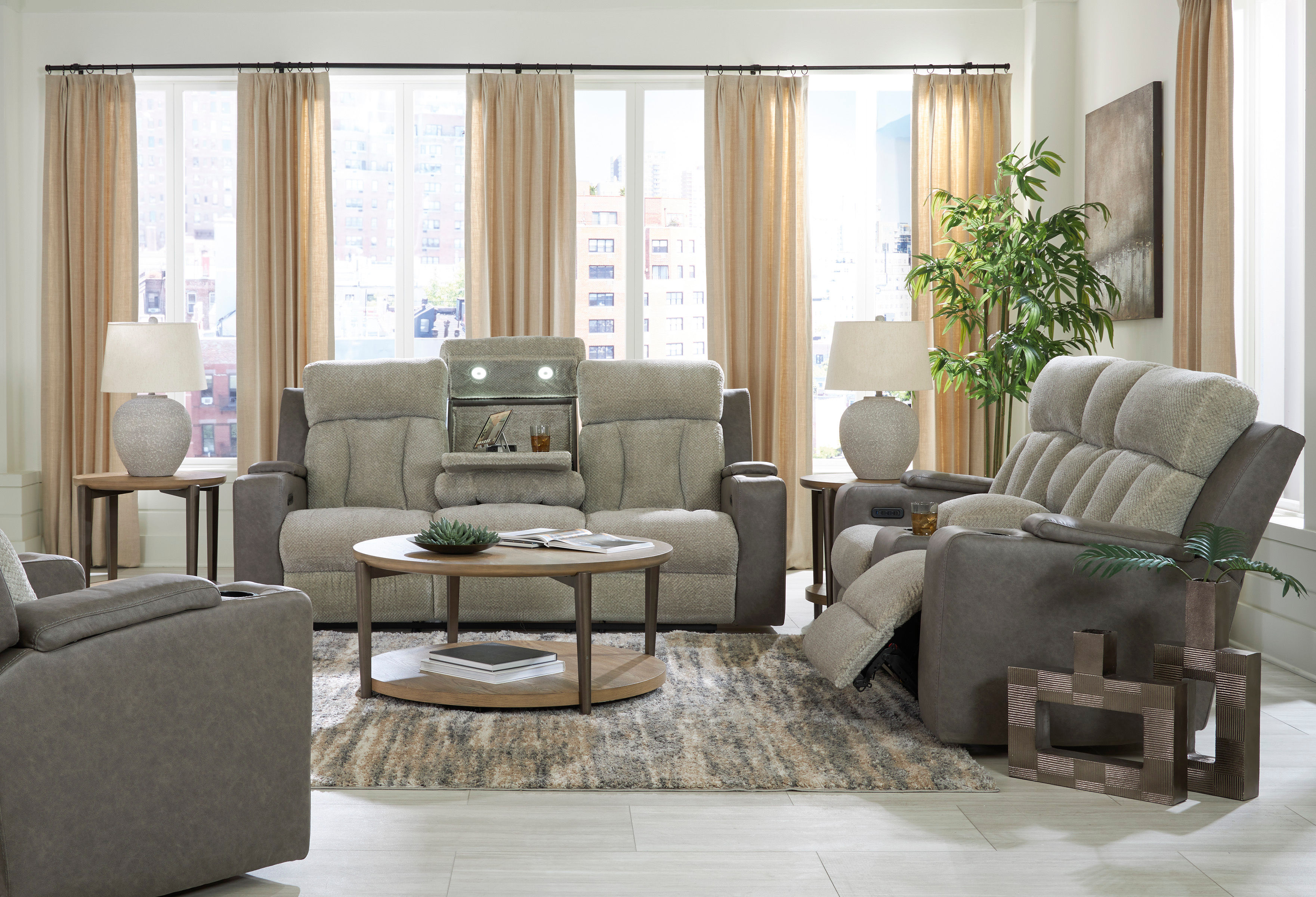 Contemporary style meets plush comfort with the Stately Check power recliner. Made with tons of advanced features to enhance your relaxation experience such as; adjustable headrests, cup holders, adjustable headrests, USB charging, massage features, a heated seat and storage in the armrests, you'll never want to get up from this recliner. The fabric upholstery on the seat and back cushion create a visually interesting contrast to the faux leather upholstery on the rest of the Stately Check power recliner.