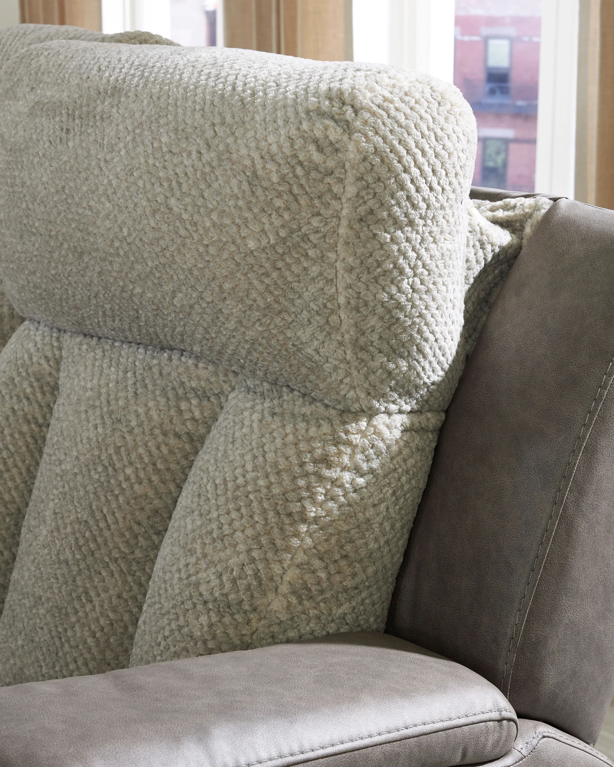 Contemporary style meets plush comfort with the Stately Check power reclining loveseat. Made with tons of advanced features to enhance your relaxation experience such as; adjustable headrests, a center console with storage and cupholders and USB charging, you'll never want to get up from this reclining loveseat. The fabric upholstery on the seat and back cushions create a visually interesting contrast to the faux leather upholstery on the rest of the Stately Check power reclining loveseat.