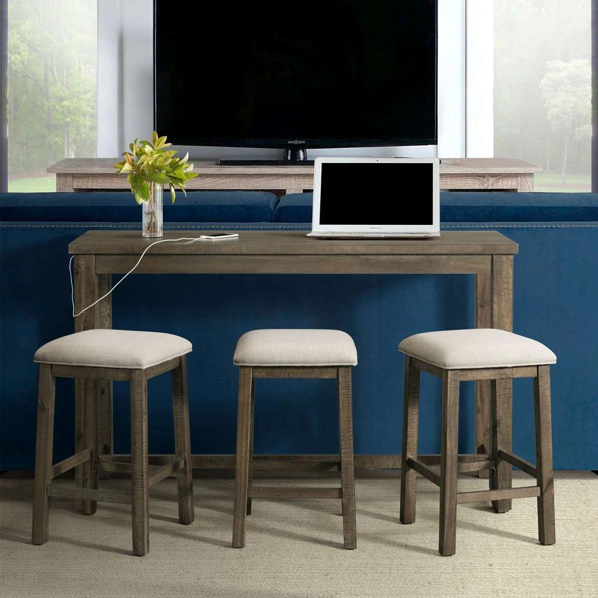 The Stone bar-height dining table is a multi-functional set. Add this bar-height dining table behind your sofa, infront of a window or in your dining room, wherever you want additional seating or table space. This bar-height dining table features a light grey finish, with clean lines, paried with upholstered barstools. Make the most of your living space with this bar-height dining table set.
