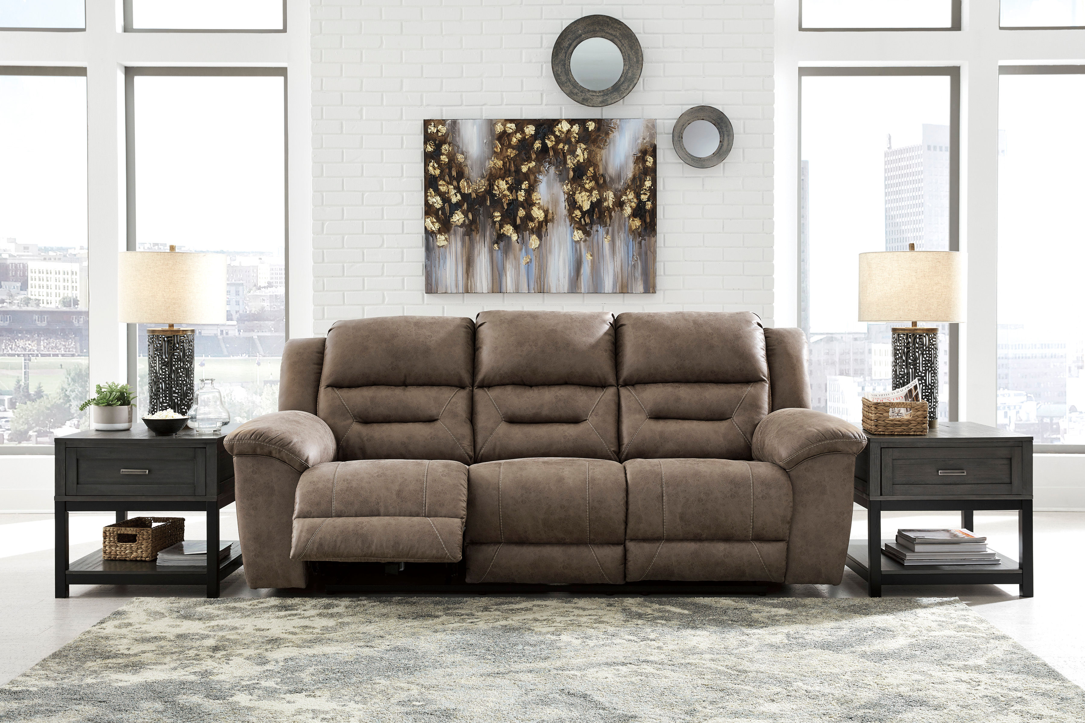 For those that love the cool look of leather but long for the warm feel of fabric, the Stoneland power reclining sofa delivers both with ease. Its high-performance padded faux leather is remarkably durable and easy to clean, just the thing for family spaces. When it’s time to relax, the one-touch power control puts the perfect position at your fingertips. Channel-stitched back cushions provide indulgent lumbar support for maximum seating comfort—not to mention fashion-forward flair.