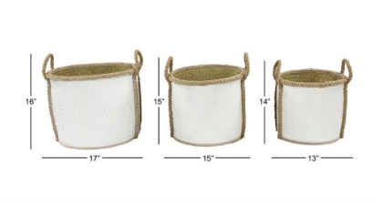 Inspired by blissful serenity and the allure of the sea, where soothing hues and natural textures bring effortless charm to the home. This storage basket set is woven with plant fiber material. Baskets highlight a daisy white finish with natural brown accent details. Each daisy white storage basket rope handles that extends to the bottom as support.
