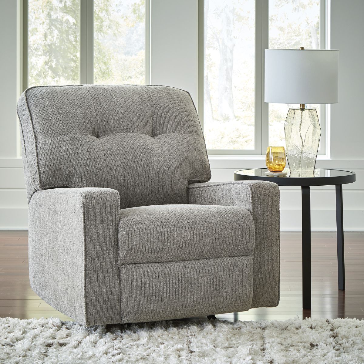 Sincere in its styling, this recliner marries classic function with modern design elements for truly transitional appeal. Its track arms lend a contemporary vibe, while easy pull tab reclining ups the comfort level. And with the recliner's goes-with-anything neutral upholstery, styling is made simple. All that’s left for you to do is sit back and relax.