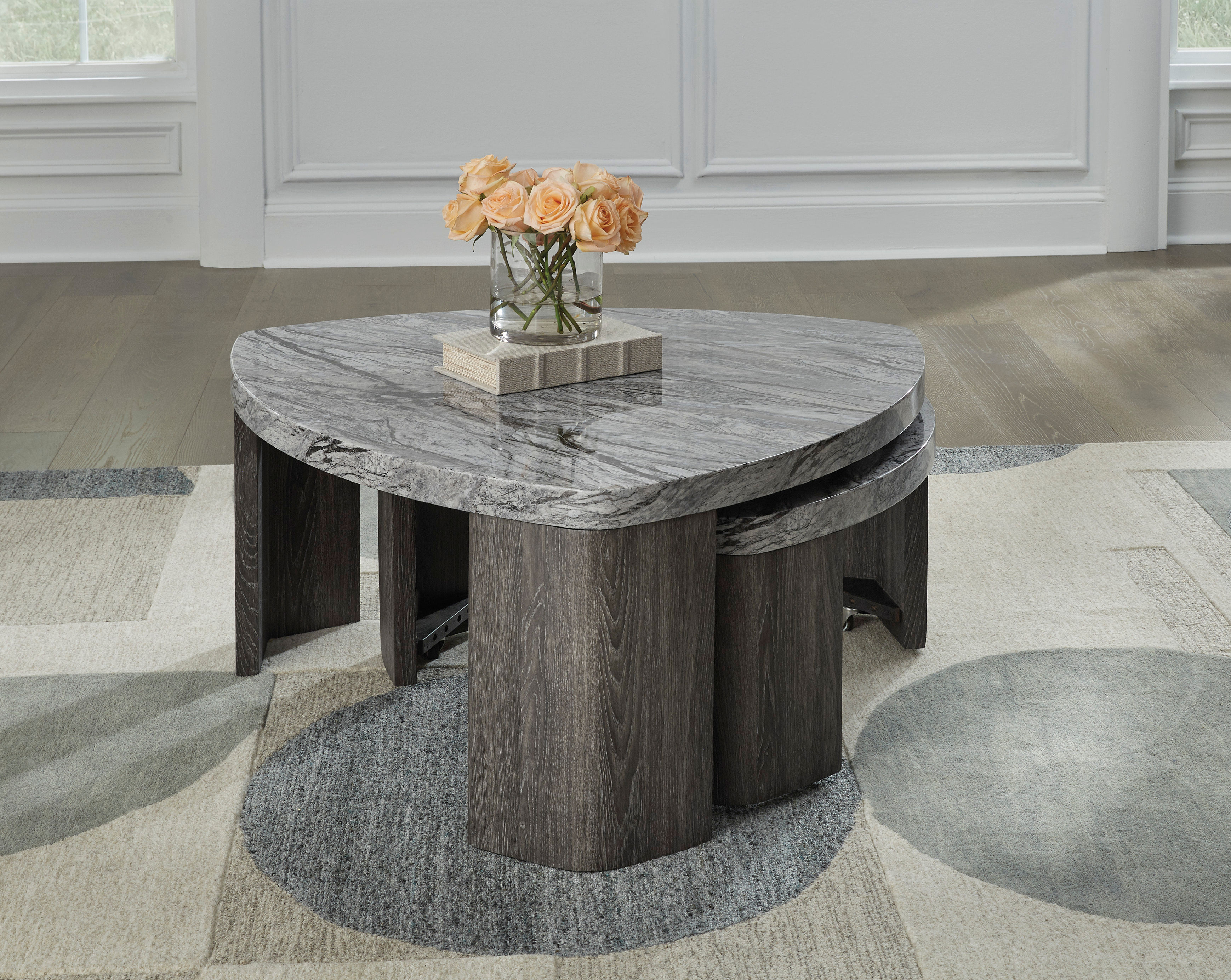 Striking contemporary form, meet can’t-miss function. This stacked coffee table pairs the look of faux gray marble with a weathered gray wood grain for a simply chic approach to monochromatic style. Make the most of your space with its cantilevered design—simply roll out the pivoting lower table when you need the extra room, and effortlessly tuck it away when you don’t. What a luxe take on everyday living.