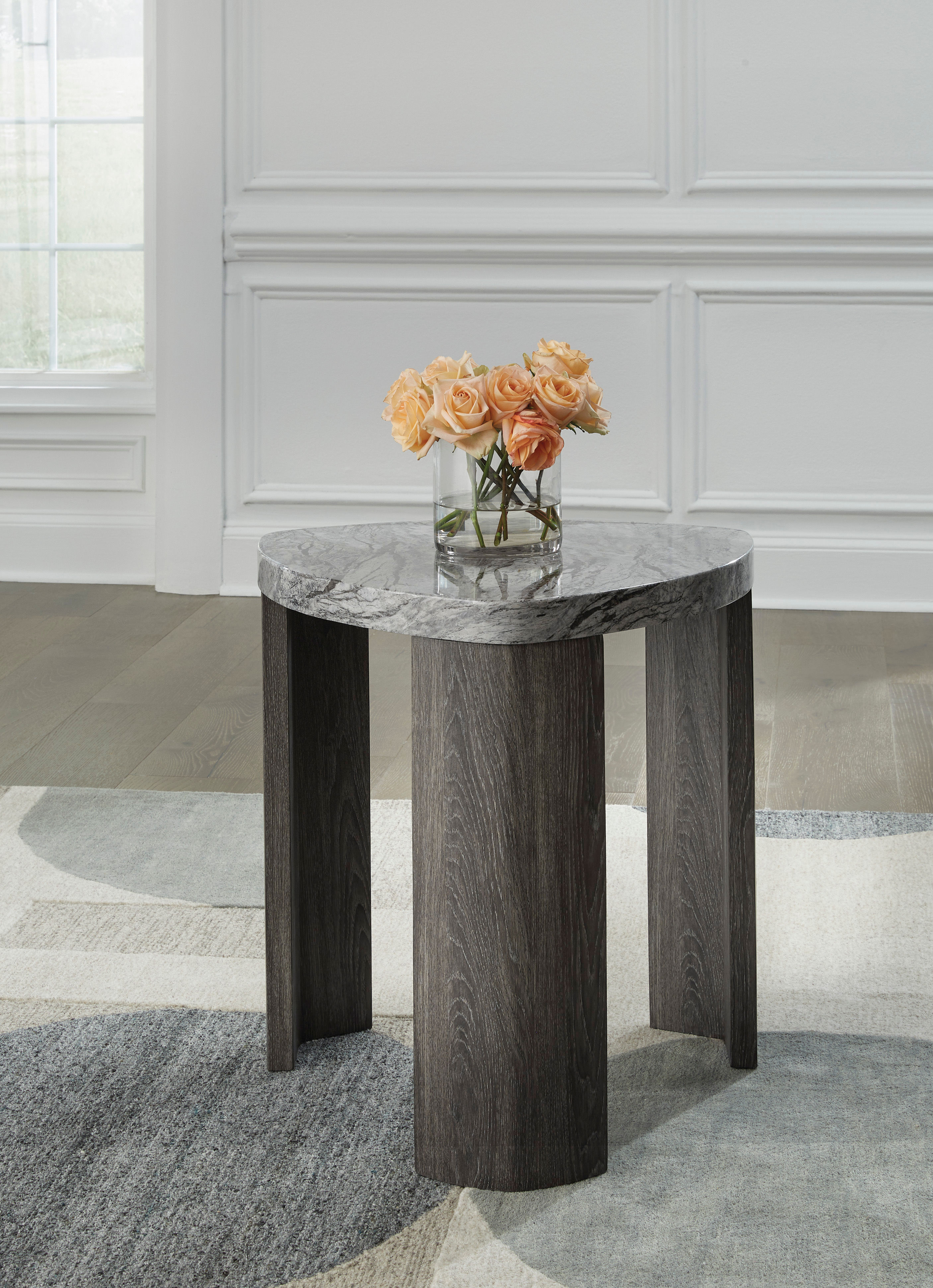 Striking contemporary form, meet can’t-miss function. This end table pairs the look of faux gray marble with a weathered gray wood grain for a simply chic approach to monochromatic style. Perfect as a perch for remotes, a lamp or morning coffee, it’s a luxe take on everyday living.