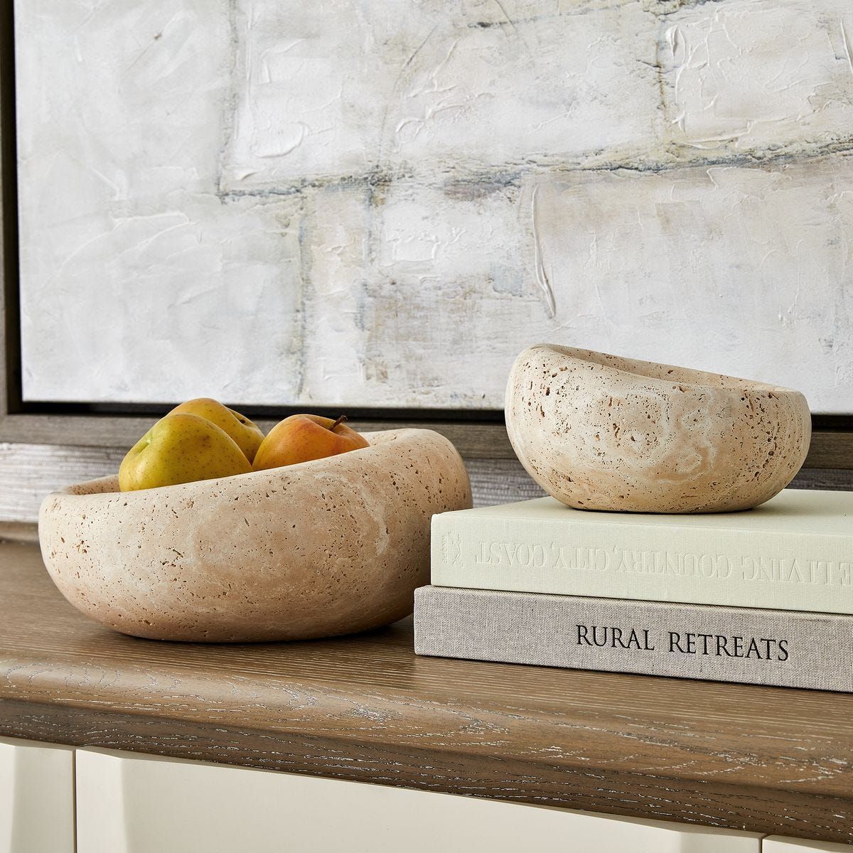 A set of two carved and hand-finished unfilled travertine bowls have soft organic sculptural shapes. The travertine is a warm color with a soft honed finish. Suitable for outdoor use.
