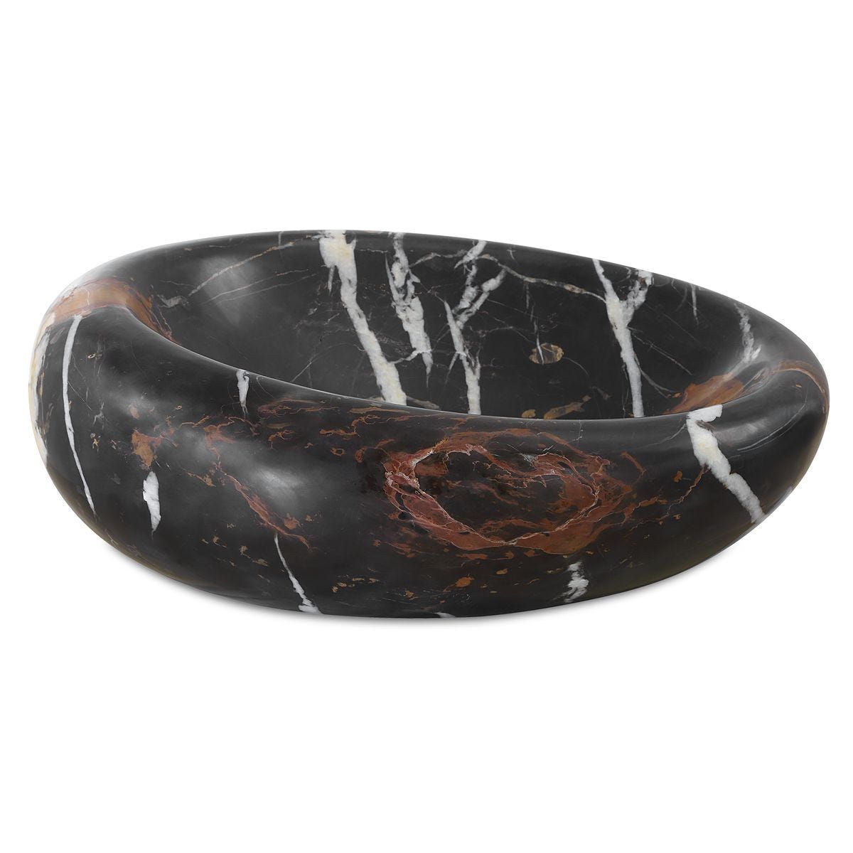 A large scale carved and hand-finished Michelangelo marble bowl has a soft organic sculptural shape. Michelangelo marble is a deep dark brown color with white and light bronze color veining. Due to the nature of marble, each piece varies and ensures yours is unique. Suitable for outdoor use.