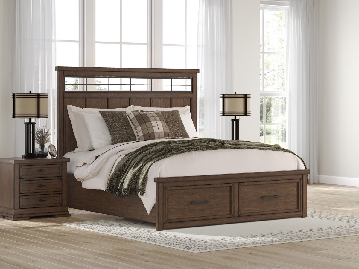 Style, simplicity and charm are hallmarks of this king panel storage bed. Created with casual spaces in mind, it has the versatility to suit styles from craftsman to modern farmhouse. The rich brown finish aligns with your refined-meets-relaxed approach to everyday style. Short on storage space? Ultra-spacious under bed drawers keep extra clothes and linens neatly tucked away. And for a timeless touch, black metal fretwork on the headboard brings an inviting mixed-material feel to the overall look.