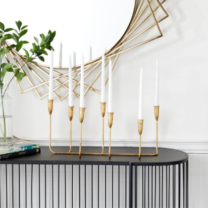 Embrace artistic expression with a style that highlights bold designs with sleek lines, neutral elements, and a minimalist aesthetic. The gold decorative candelabra is crafted from iron, ensuring durability and elegance. The asymmetrical candlestick stand features a satin gold finish that adds a luxurious touch to any setting. This metal candelabra boasts an opulent design with seven cups for taper candles, showcasing a slender frame with unique details.