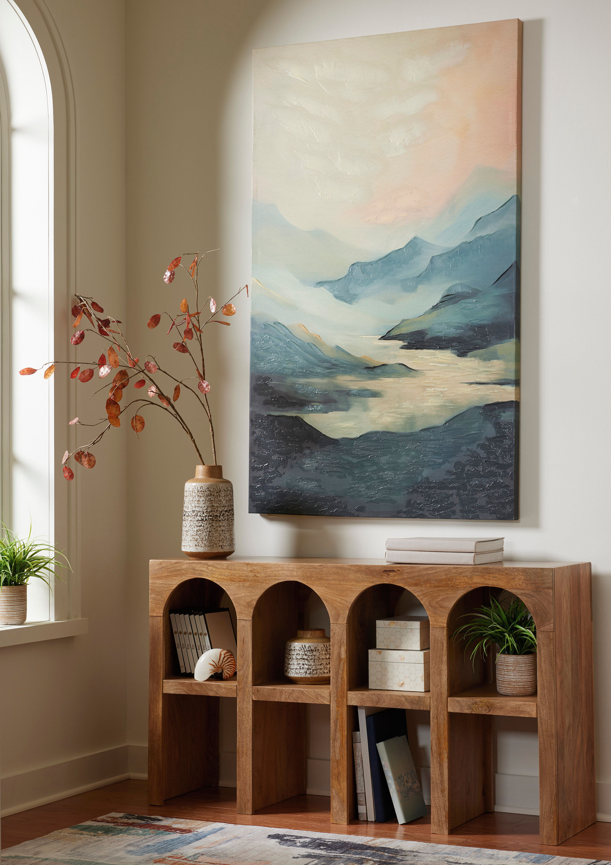 This abstract landscape is the perfect way to spread serenity throughout your home. Low-lying clouds dance between mountains as the peachy hues of the sun peek through above. It’s a soothing take on casual style, radiating a relaxed aura wherever you hang it.