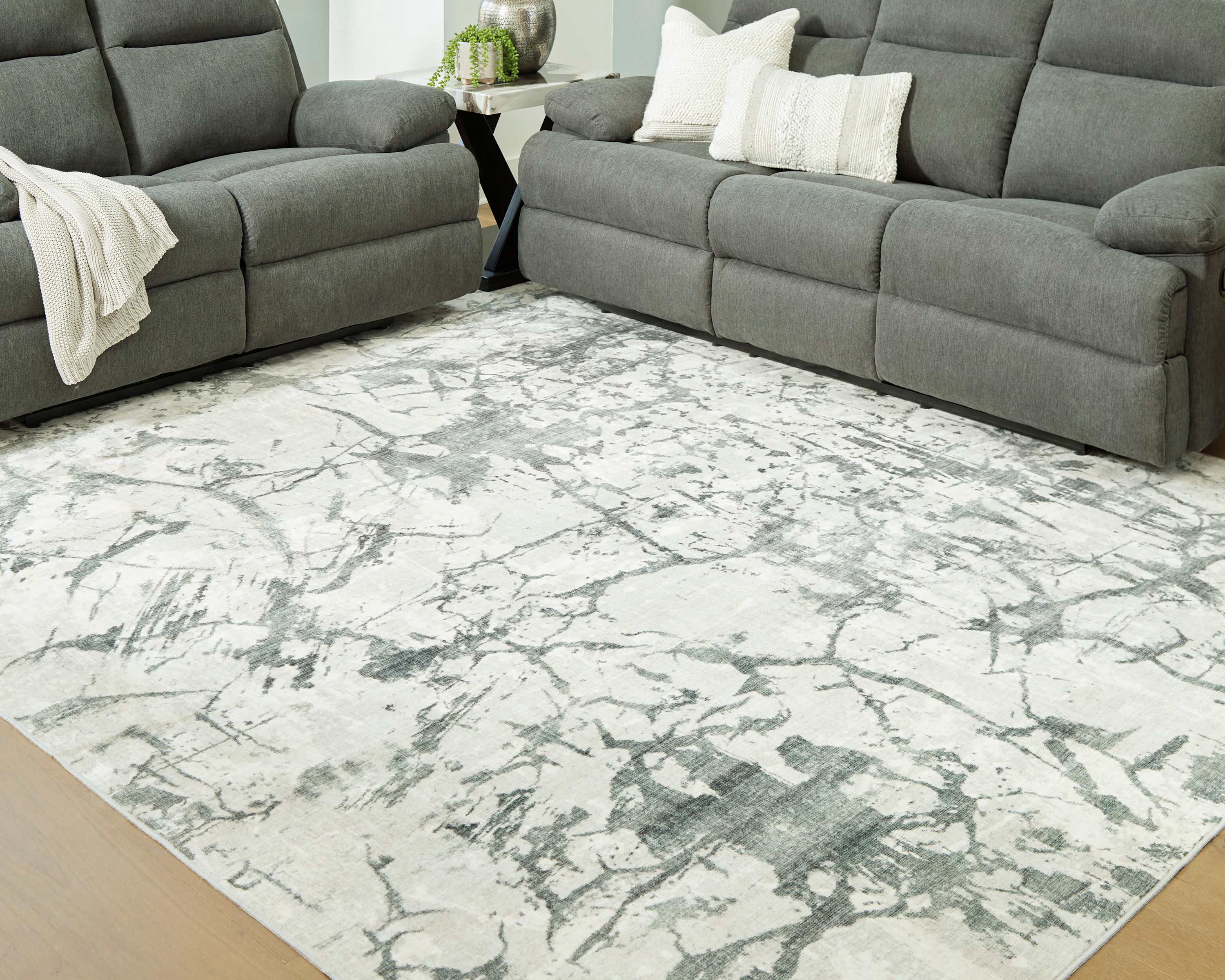 Make a statement that effortlessly complements your modern sensibilities. This rug adds an intentionally curated feel underfoot, with versatile shades of gray forming an intriguing abstract design. Crafted with comfort and convenience in mind, this soft faux fur rug is machine washable.