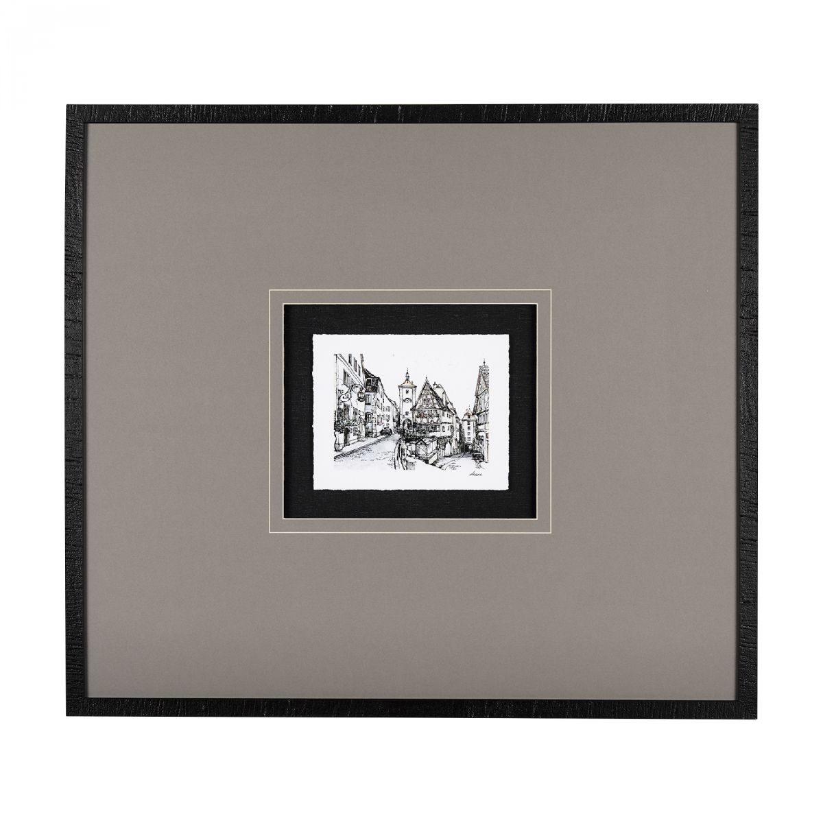 "Travel memories I" by Natalia is a captivating framed art print showcasing a detailed pen and ink sketch of a charming European street scene. The intricate lines bring to life the historic architecture, with black and white contrasts highlighting the timeless allure of the cityscape. Matted under glass in an elegant frame, this piece captures the essence of classic urban beauty and transforms any space into a sophisticated retreat.
