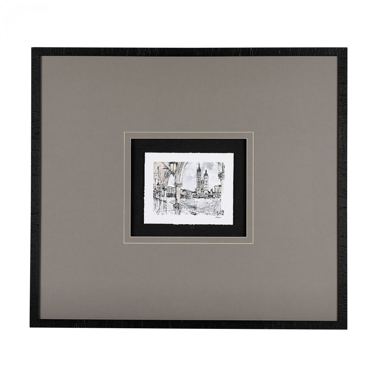 "Travel memories IV" by Natalia is a captivating framed art print that transports you to a serene architectural vista, skillfully rendered in delicate ink and watercolor. The subtle contrasts of grayscale and soft hues evoke a sense of timeless elegance, while the intricate details invite closer admiration. Matted under glass, this piece is a testament to the artist's inspiration drawn from the beauty and grandeur of classic urban landscapes.