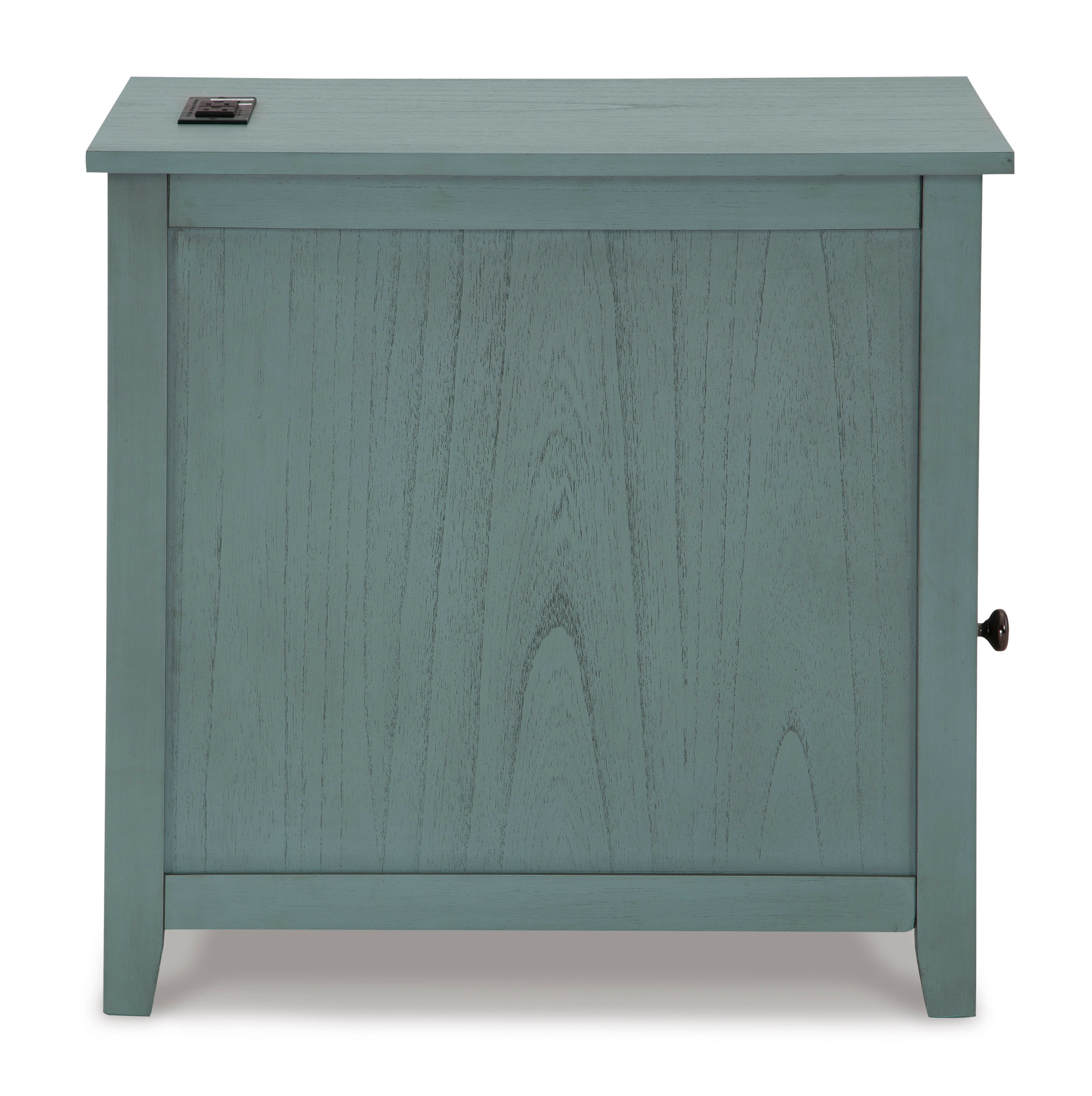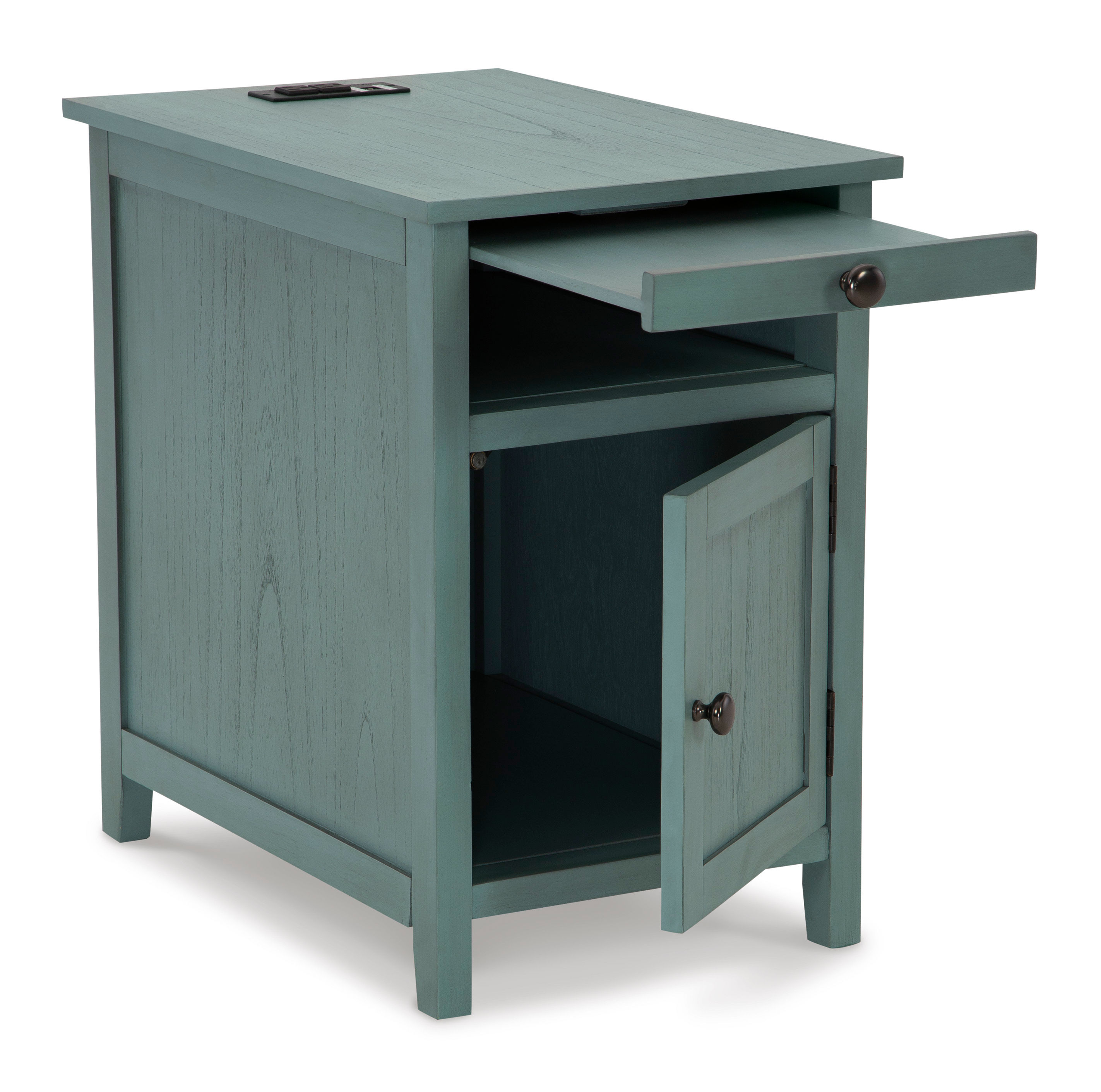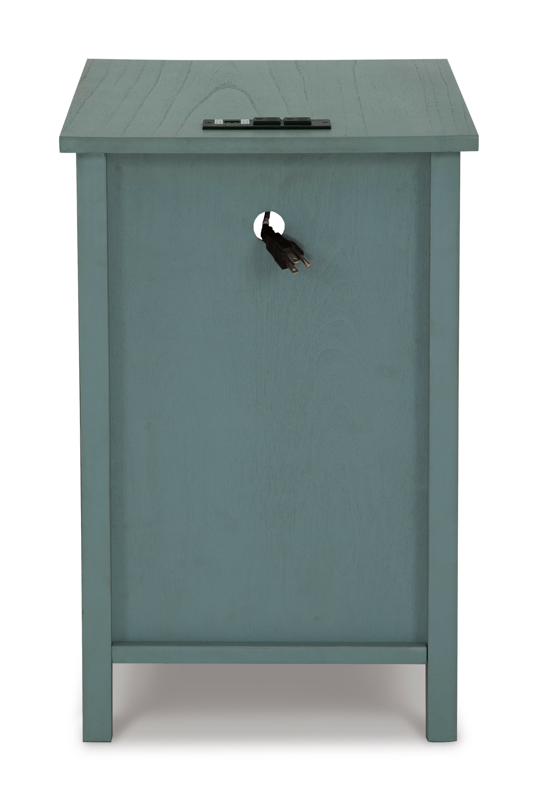 Add big character to a small space with the Treytown chairside end table. With its compact size and strong silhouette, it can go anywhere and blend easily into the decor. Less is so much more with the Shaker-inspired design and teal wood tone finish. Loaded with form and function, this end table displays accent pieces and stores essentials securely while keeping devices powered up.