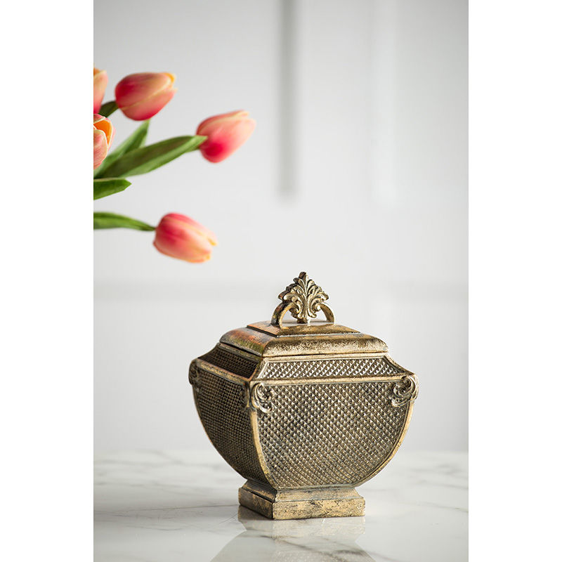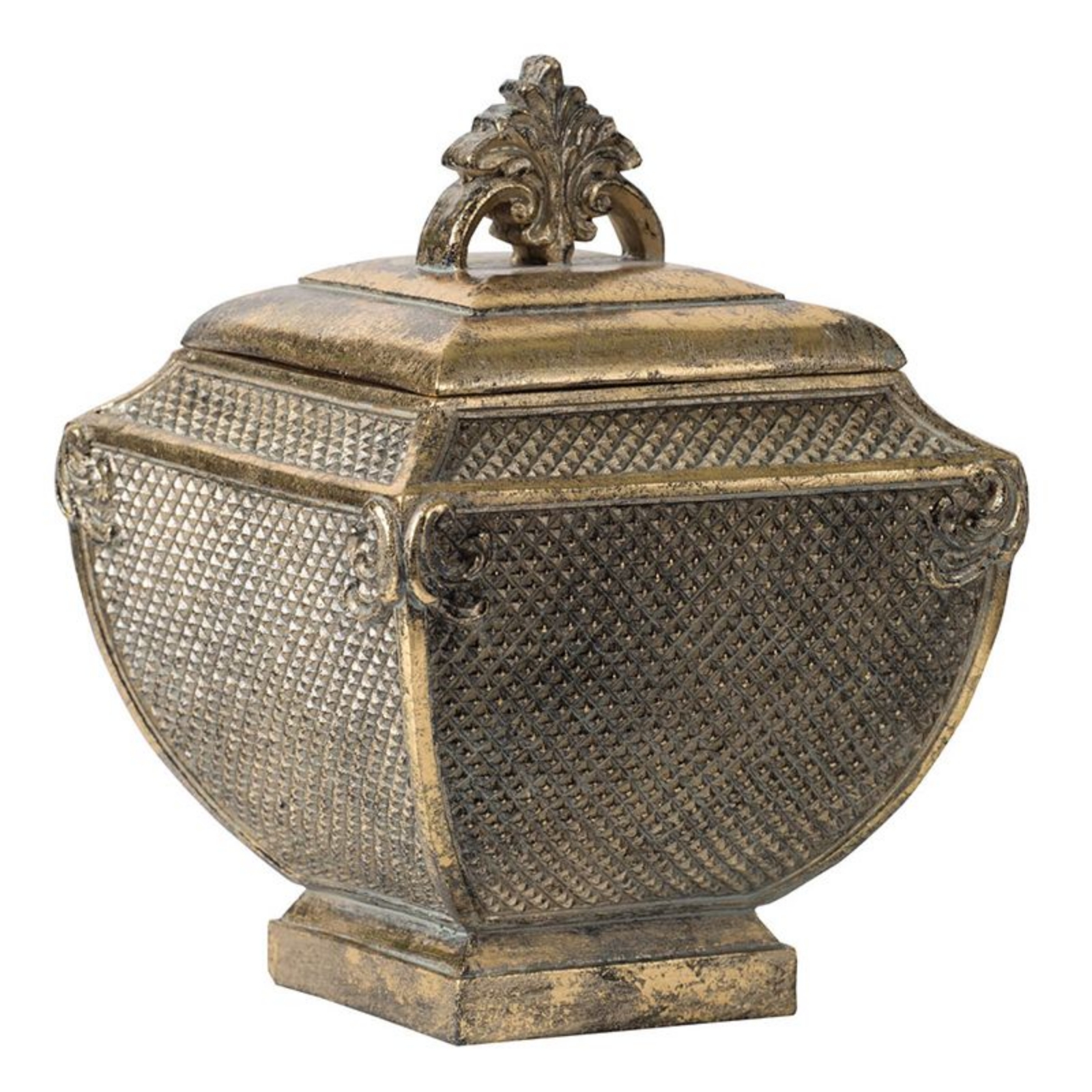The antique gold finish of this decorative trinket has a diamond pressed pattern that lends textural appeal to this piece. Scrollwork details and a shield shape will invite interesting dimension to your decor. Place it on a side table or console to display its unique aesthetic and elevate surrounding decor.