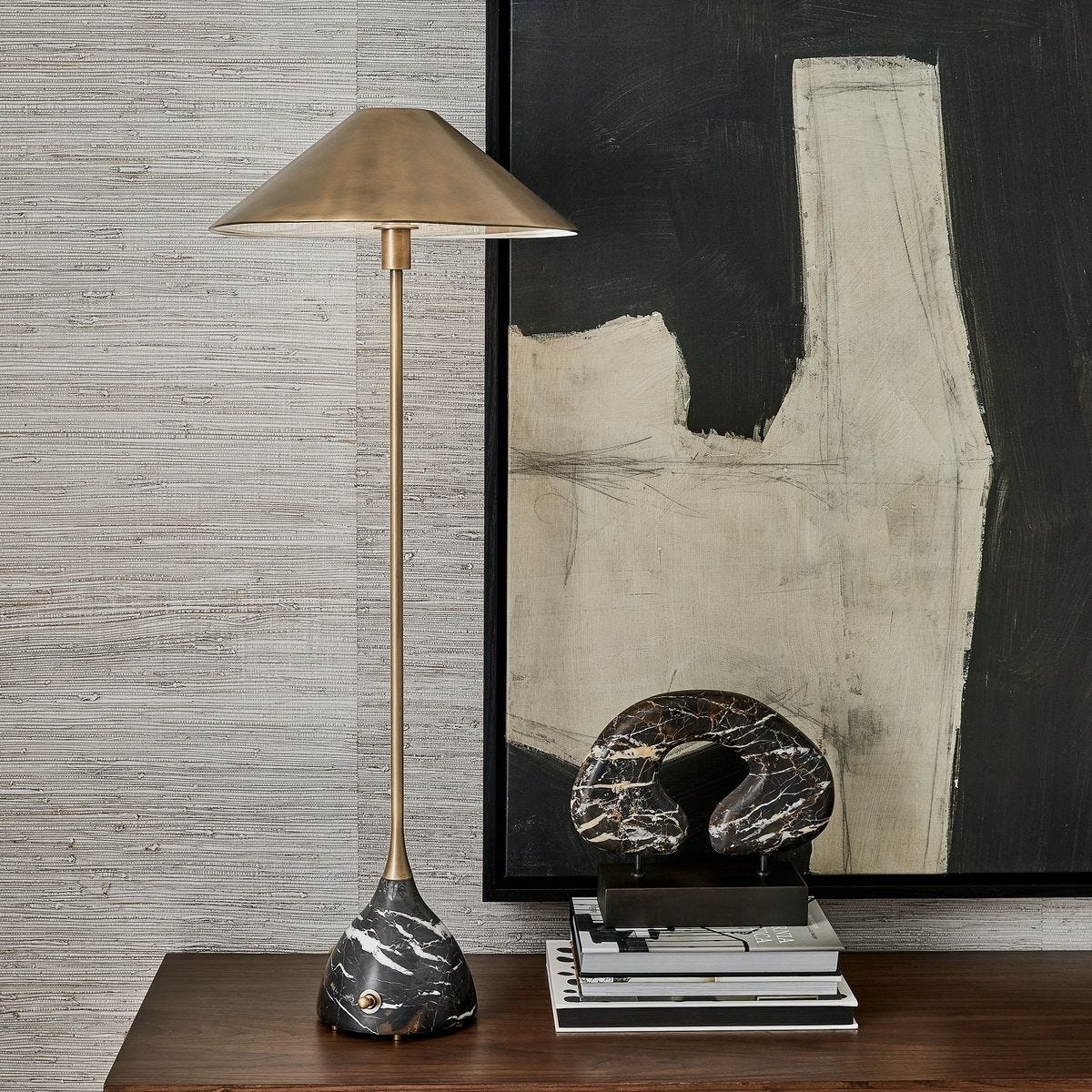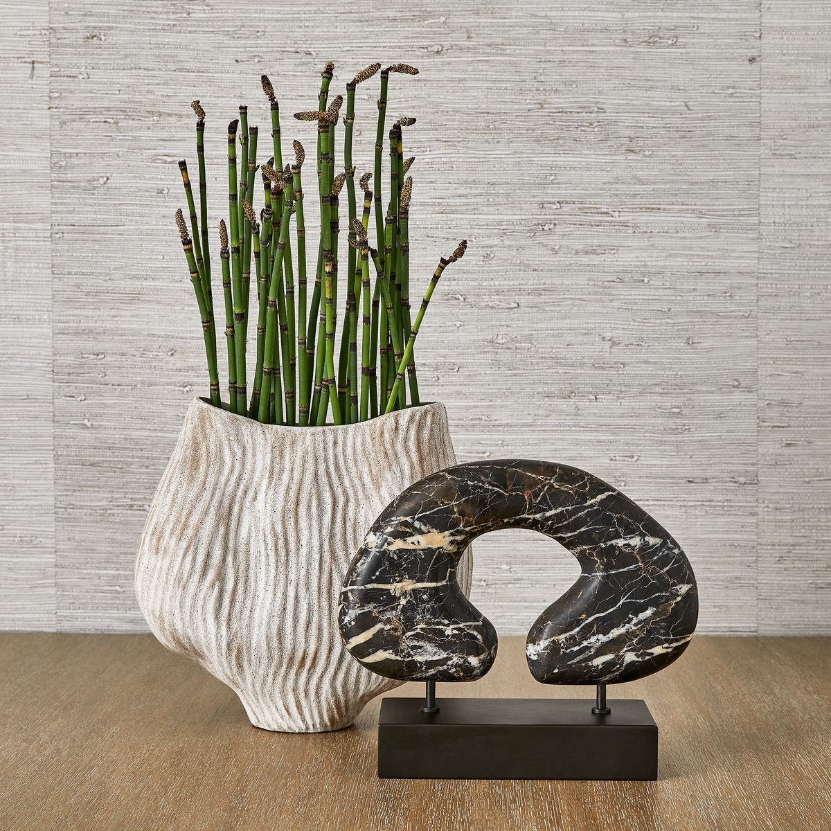 Michelangelo marble has been carved then honed to showcase the brilliant gold and white veining unique to each piece. On a bronzed steel base and sized for bookshelf or table display, this piece can stand alone but mixes easily in a grouping. True to the nature of natural materials, each piece will have unique marbling and veining throughout.