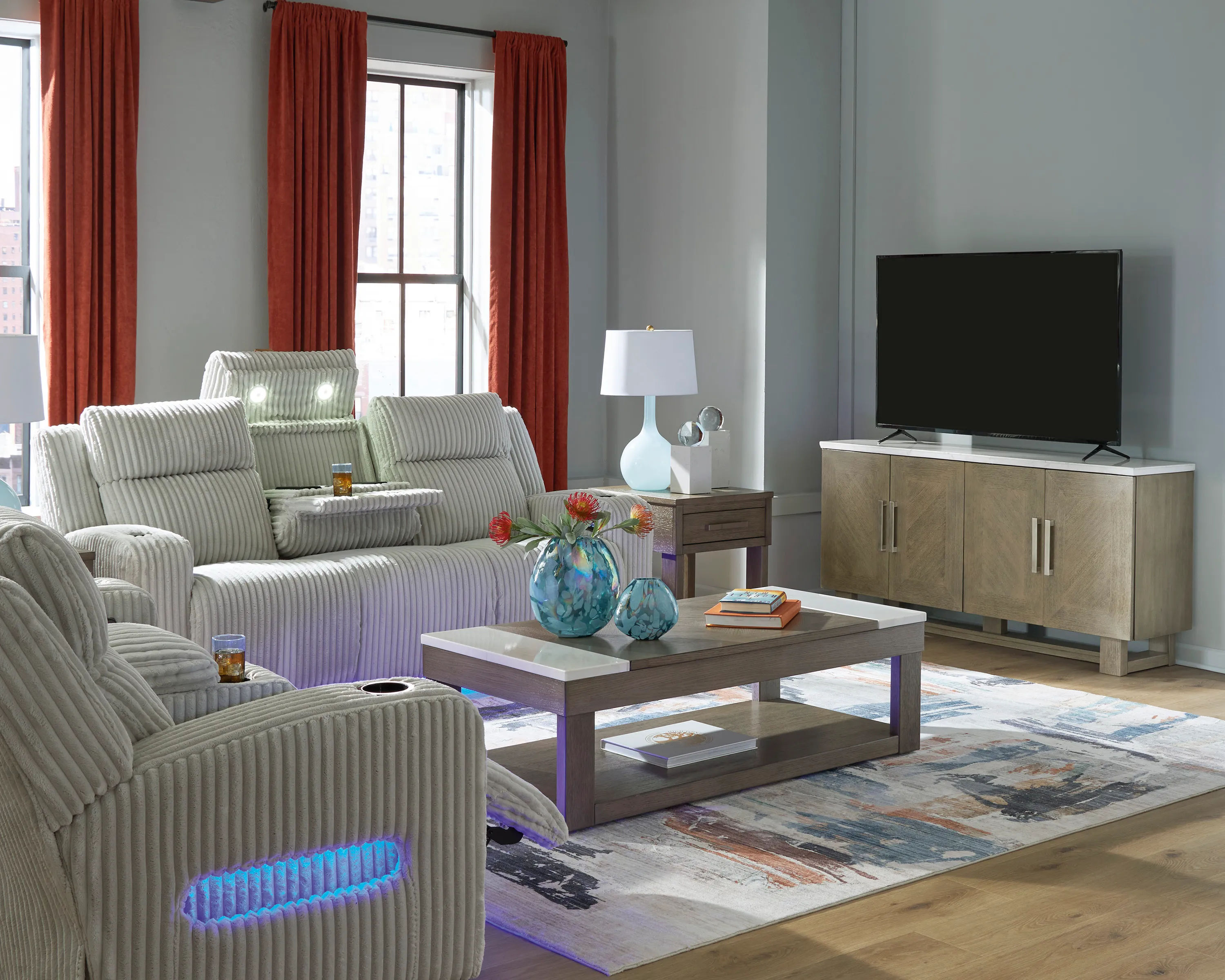 Trend-right style, meet irresistible modern function. Your living room gets a cozy-cool upgrade with this power reclining sofa. Curl up in its ultra-chic corded upholstery and recline with one-touch controls. Is it movie night or game time? With ambient LED lighting and wireless audio connectivity, this sofa transforms from a serene relaxation spot to an entertainment hub. Its drop-down table, USB charging and cup holders make lounging all the more convenient.