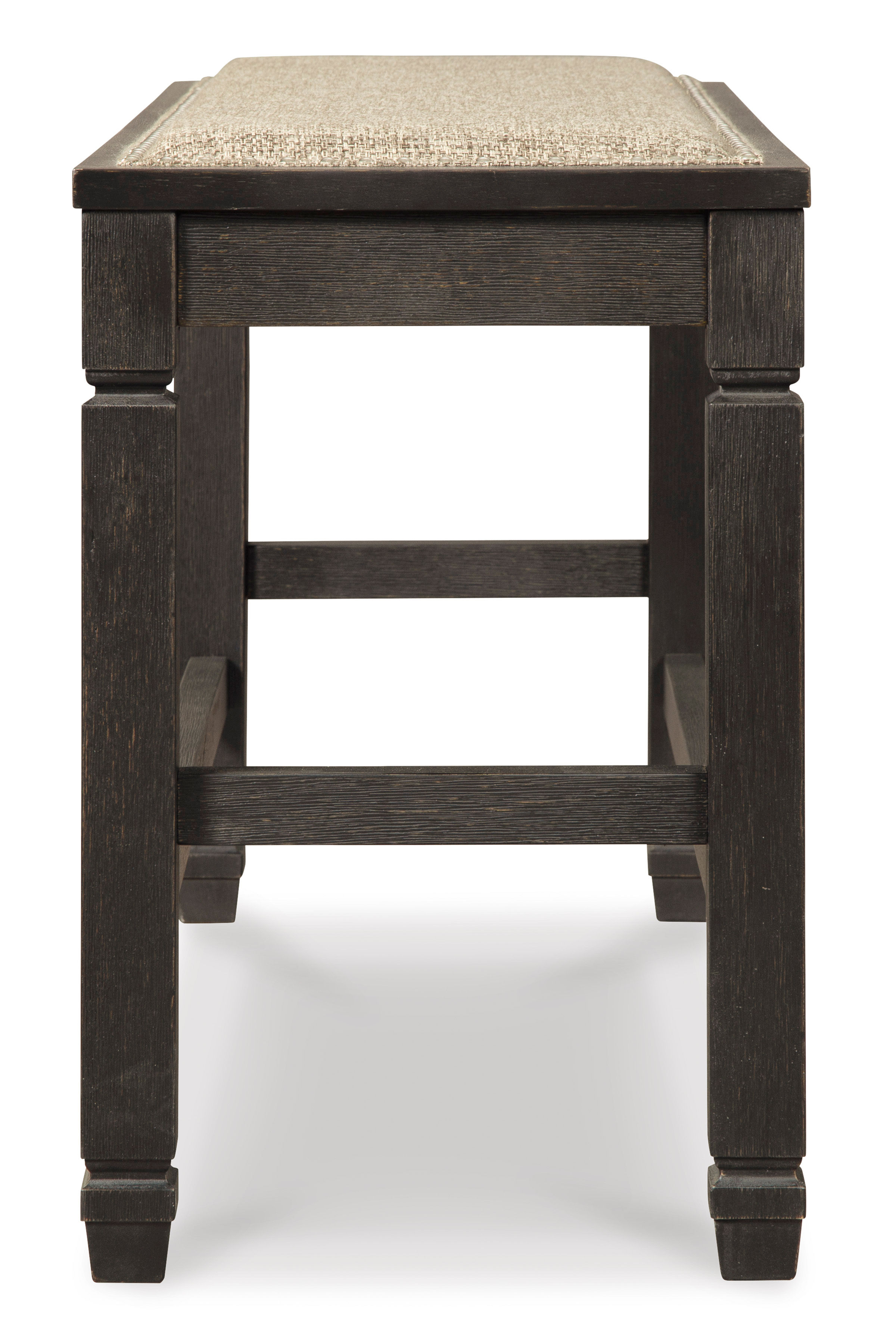 Invite your family into the heart of your home with the Tyler Creek upholstered dining room bench. Tapered legs are a sturdy foundation, while the counter-height design raises the bar on fine dining. Textured black finish and heavy woven neutral upholstery accented with silvertone nailhead trim is trend-right urban farmhouse style without all the fuss.