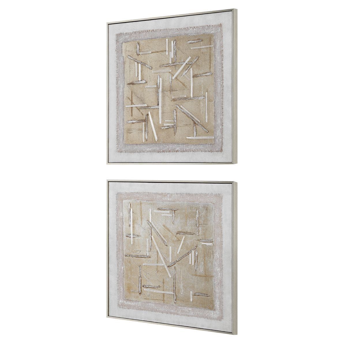 Featuring hand-applied linen and scattered gypsum details, each hand painted canvas is encased in a brushed champagne gold gallery frame, offering a modern yet timeless aesthetic for your space. Due to the handcrafted nature of this artwork, each piece may have subtle differences.